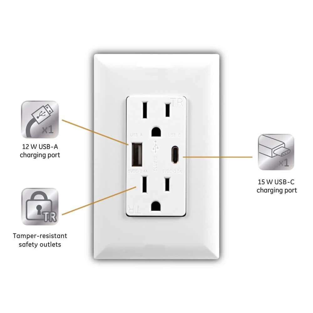 Get the most from your outlets with a GE-branded In-Wall USB Charger. Featuring two grounded outlets, one USB-C and one USB-A port, the receptacle transforms your regular outlet into an efficient, multipurpose charging station. The USB-C port provides 3.0 Amp and 15-Watt of power for your newest devices while the USB-A port covers your traditional electronics with 2.4 Amp and 12-Watt. Simply replace any indoor outlet in your home or office with the in-wall receptacle for a convenient place to power your devices. The versatile plug-in options make it convenient to connect even where space is limited the in-wall receptacle reduces the need for adapters and creates a neat, organized charging space for smartphones, tablets, wearables and more. Along with a standard white faceplate, the in-wall receptacle includes an additional light almond faceplate to fit a variety of decor styles. The patented changeable faceplate is also available in black, ivory and brown. Take charge with a GE-branded In-Wall USB Charger.