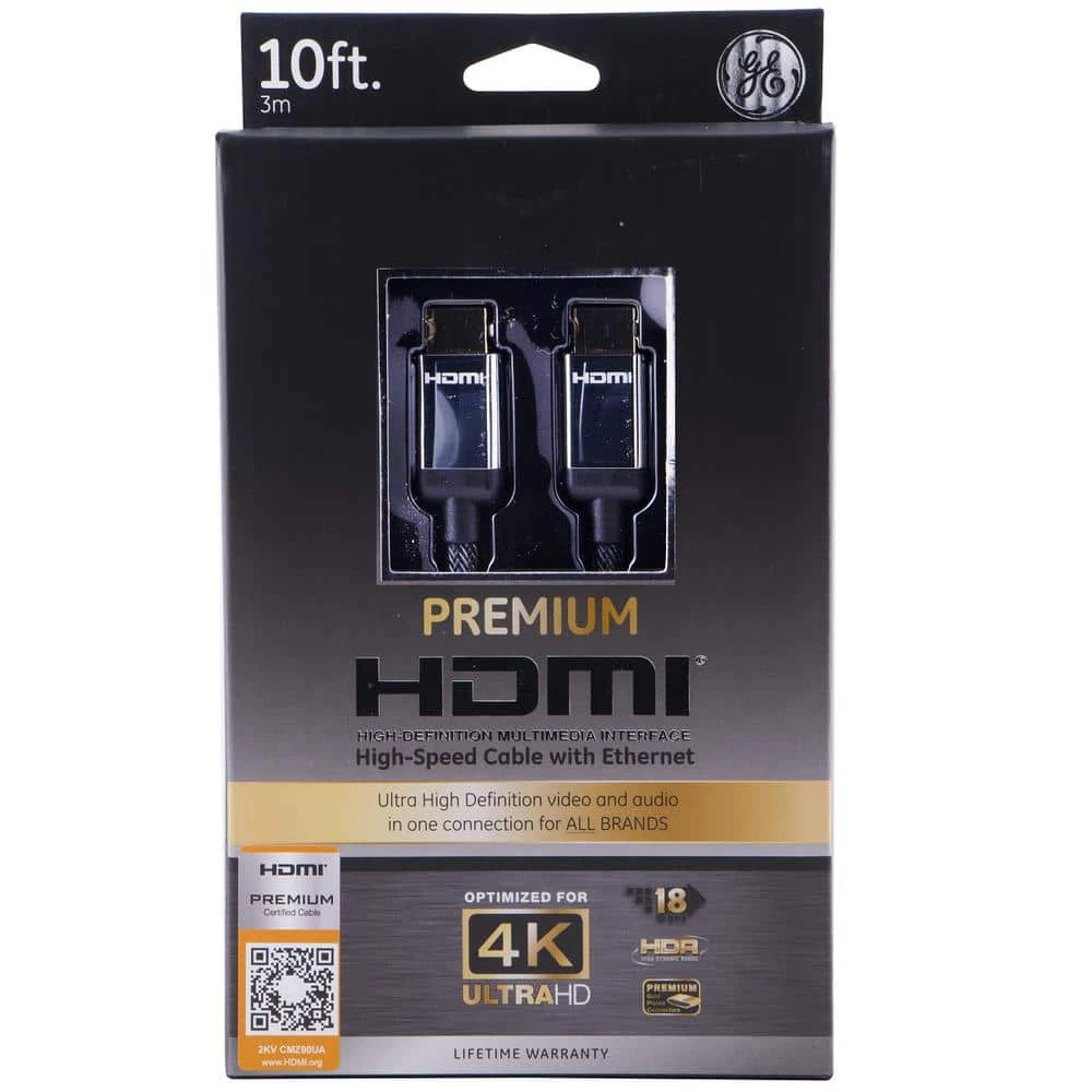 Get the highest-quality signal for your digital audio and video equipment with the GE HDMI 10 ft. cable. The GE HDMI cable is a premium certified digital cable designed to provide a lossless surround sound and a crystal clear HD/ultra HD picture for 4K ultra HD resolution in a single connection for all brands. The cable supports enhanced communication between today’s and tomorrow’s devices while providing lightning-fast refresh rates, deep color, and 4K ultra HD picture technology for the ultimate HD/ultra HD experience. You can use it with Smart TVs, streaming devices, DVD/Blum ray players, cable boxes and drovers. This HDMI cable features smooth video refresh rates, Lossless 5.1 and 7.1 surround sound, and premium gold-plated contacts. The plug and play experience gives one simple connection for all brands that are HDMI compatible. This product comes with a limited-lifetime warranty.