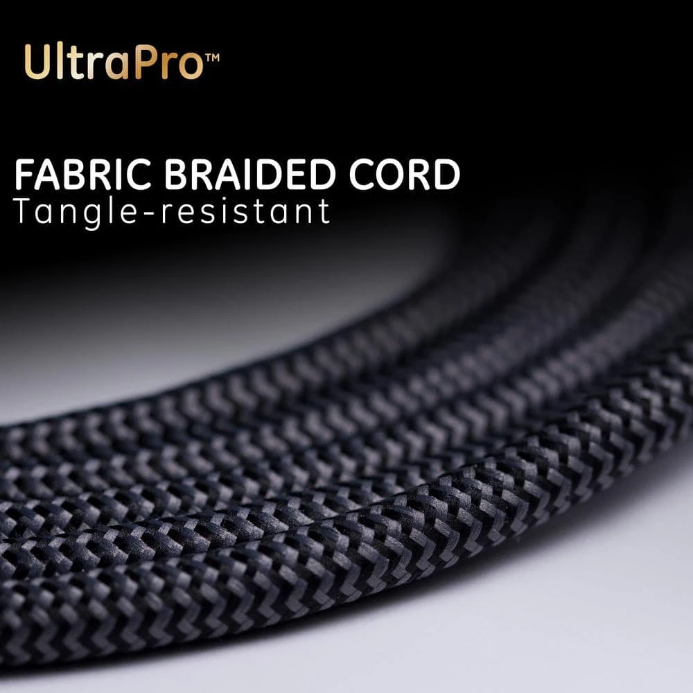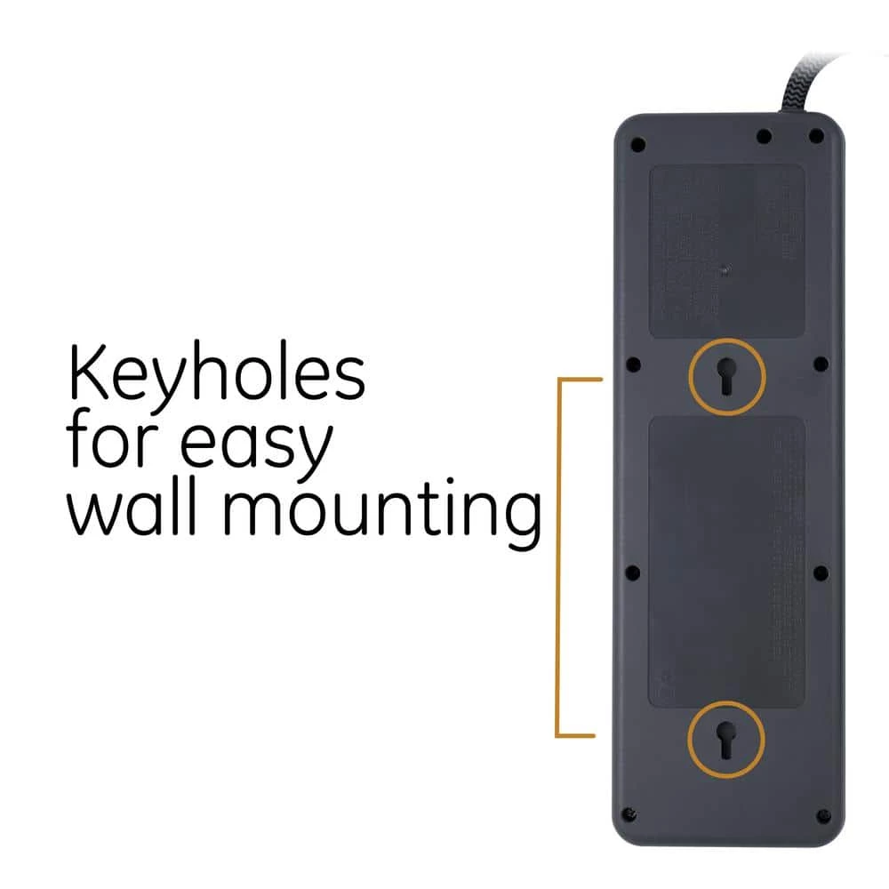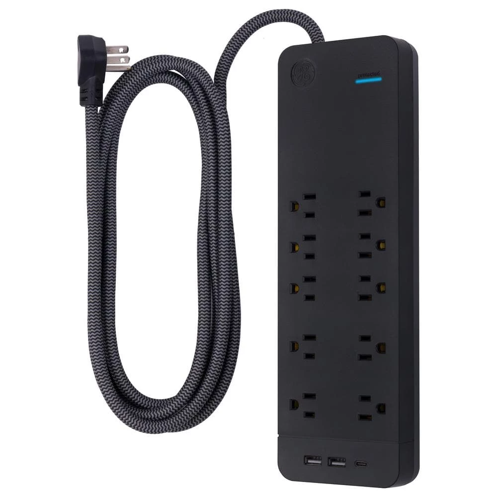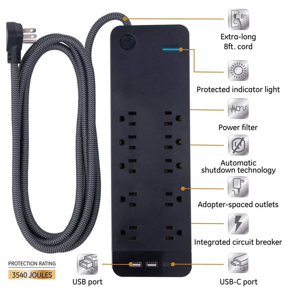 Stay connected and protected with the GE UltraPro 10-outlet 8 ft. Surge protector with USB charging. Its sleek design makes it an aesthetically appealing addition to any home or workspace. This includes the unique black and gray combination of the surge protector itself, plus the attractively braided cord that resists tangling. The 3,540 joule surge-protection capacity helps to ensure that connected equipment stays safe from harmful voltage spikes. For overload protection, The surge protector Features an integrated circuit breaker. Additionally, automatic shutdown technology cuts off power to your devices once surge protection expires. With built-in USB-A and USB-C ports, your mobile devices can charge directly from the surge protector. Do not exceed the electrical ratings of 120VAC, 15A and 1800W. This surge protector is UL listed. For A premium design that offers equal parts fashion and function, make a connection with the GE Ultrapure 10-outlet 8 ft. Surge protector with USB charging.
