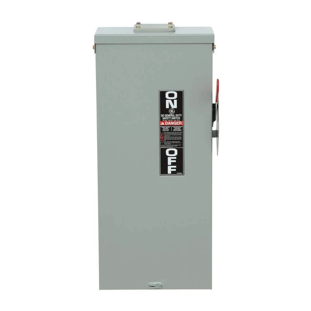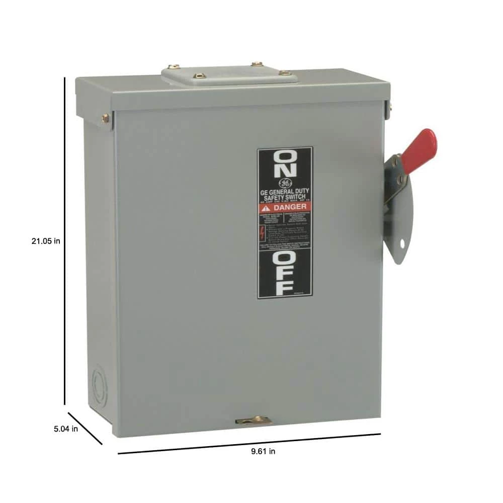 This GE 100 Amp 240-Volt Fusible Outdoor General-Duty Safety Switch offers a type-3R rated, galvanized steel enclosure for superior rust protection in outdoor applications. This safety switch features a highly visible on/off label to help ensure safety and lend a clean, modern appearance. The 3-point mounting pattern simplifies installation and ganging in close spaces.