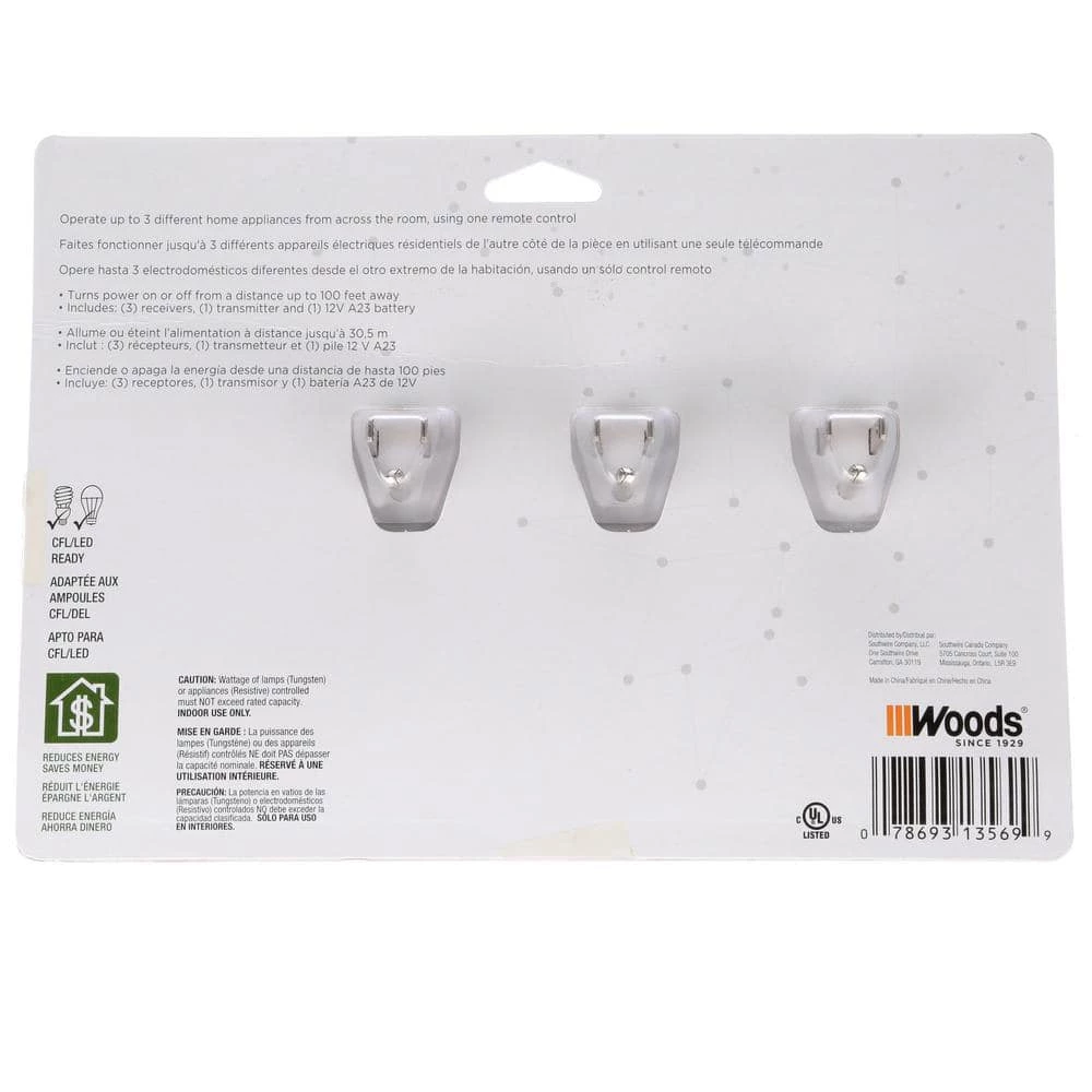 The Indoor Plug-In Digital Wireless 3-Outlet Remote Timer, White (3-Pack) turns appliances on and off from up to 66 ft. away. Operate 3 different home appliances from across the room, or another area of your house, using one remote control. The signal from the remote travels through walls, windows or doors. Use the remote outlets in one room or multiple locations; beneficial for the mobility-impaired and anyone who just wants a one-touch, convenient way to turn light sockets or appliances on and off. This package includes (3) receivers each with a space-saving grounded outlet, (1) transmitter and 12-Volt battery. The unit is compatible with compact fluorescent lighting (CFL) and LED bulbs, and is cUL certified for quality assurance. The Indoor Wireless Remote 3-Pack offers a fast, tool-free set-up and is easy to operate by the simple touch of a button. Use it to power on lighting sockets, activate holiday displays, operate electric fans and other appliances that work with electrical sockets. Perfect for hard to reach lamps and holiday decorations. The Woods brand of timers and home controls bring simplicity to your life, by maximizing convenience, security and energy savings.