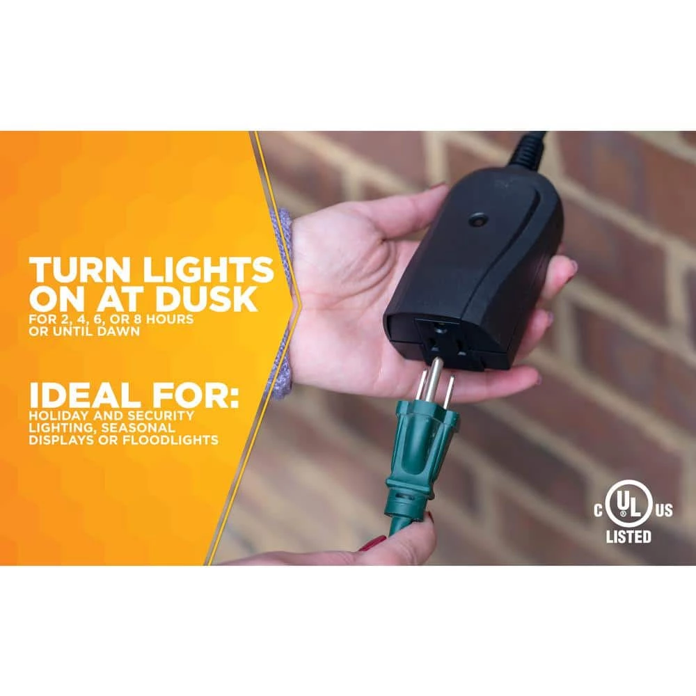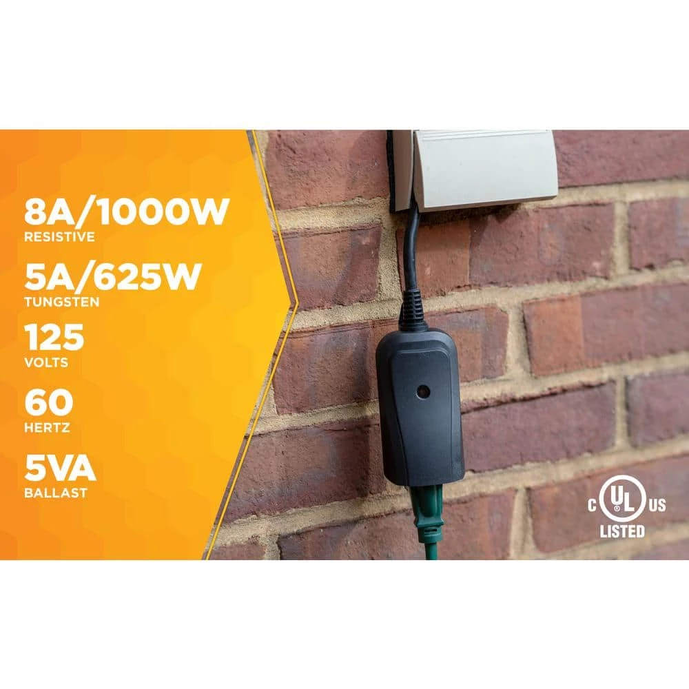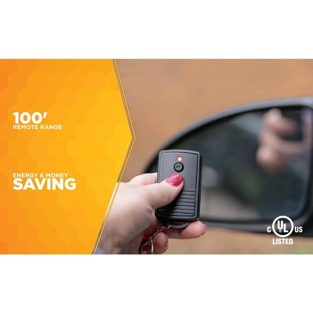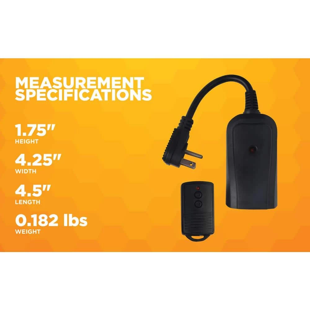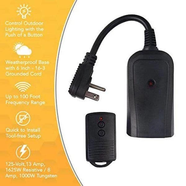 The Outdoor Wireless Remote turns appliances on and off from up to 60° Control your outdoor security lights or holiday decorations from inside your home or car. The signal travels through walls, windows and doors. This remote kit is quick to install with tool-free set-up and is easy to operate by the simple touch of a button. Features a durable, weatherproof construction, rain tight for outdoor applications, 6 in. cord and is compatible with 3-wire plugs. This remote kit includes (1) receive with a space-saving grounded outlet, (1) transmitter and a 12-Volt battery. The remote unit can be attached to your keychain, carried in a purse, or placed in your glove box. The Outdoor Wireless Remote is compatible with common incandescent or fluorescent light fixtures. It is CFL ready, LED compatible and cUL certified for quality assurance. Both the remote and receiver operate on same ‘paired’ frequency channel, so they don’t interfere with other electronics. Operate patio or security lights or holiday decorations from the comfort of your sofa with the wireless remote and receiver.