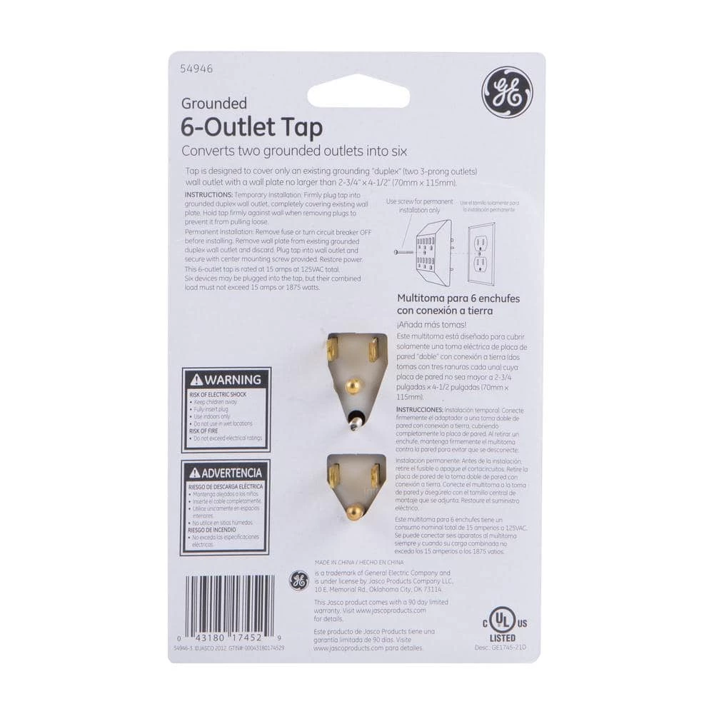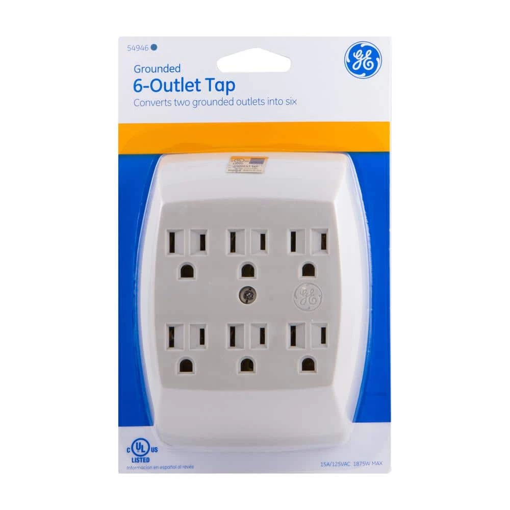 Add more-outlets where you need them most using the GE 6 Grounded-outlet Adapter Wall Tap. Accepting both polarized and grounded plugs, the tap requires use with an existing grounded duplex wall-outlet. The tap converts the duplex-outlet into six grounded-outlets, making it perfect for any needs around your home. Install with the mounting screw in the middle to secure the-outlet adapter permanently to the-outlet.