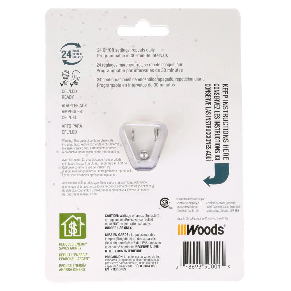 The Mechanical 3-Conductor Timer turns indoor lighting on and off at set times. Programming can be set for multiple on/off events, which maximizes energy savings and controls electricity costs by only using power when it’s needed. This plug-in timer provides up to 24 on/off settings per day and the cycle repeats every 24 hours. Easy to set in 30 minute intervals with never-lose segment pins that can’t be removed or lost. Use the manual override button to turn the timer on or outlet on, so you don’t have to delete any preprogrammed settings. This timer has an instruction slot on the side, which stores the programming manual. Designed with a warm neutral color pallet to compliment today’s home interior. The compact design fits snuggly in your outlet without blocking additional outlets. Ideal for lamps, fans, holiday lighting or other 3-conductor appliances. Would you like to come home to a lighted house at the end of the day? Switch on a fan at the same time every afternoon to cool a certain room? The Indoor Mechanical 3-Conductor Timer makes it easy; just plug a lamp, fan or other electrical appliance in, set the timer and walk away. This timer is compatible with compact fluorescent lighting, LED bulbs and CSA certified for quality assurance. The Woods brand of timers and home controls bring simplicity to your life, by maximizing convenience, security and energy savings.