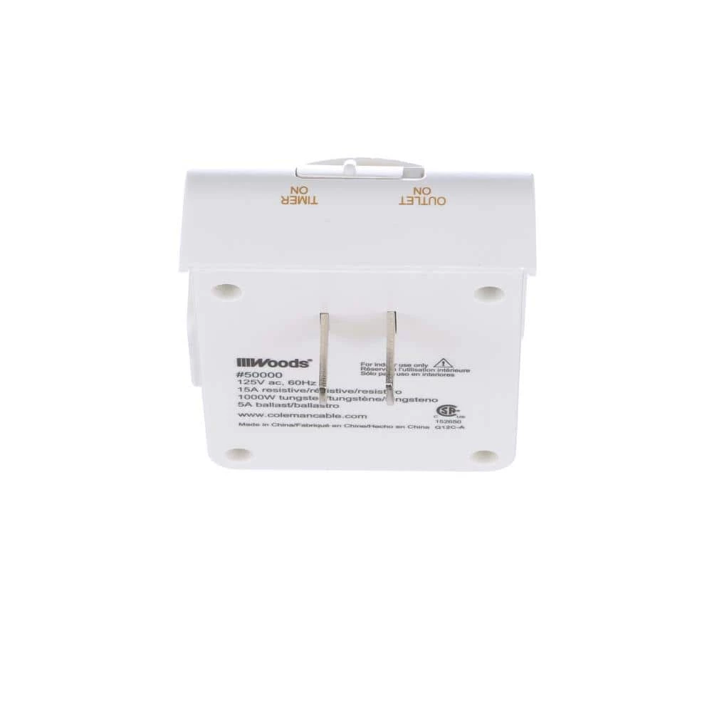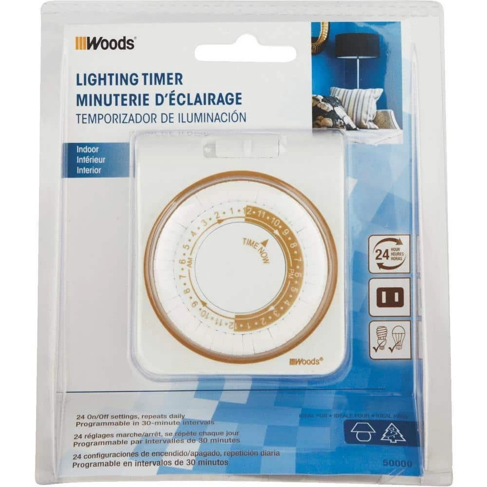 The Mechanical 2-Prong Outlet Timer turns indoor lighting on and off at set times. Programming can be set for multiple on/off events that automate everyday tasks and reduce energy costs, which can save you money. This plug-in timer provides up to 24 on/off settings per day and the cycle repeats every 24 hours. Easy to set in 30 minute intervals with never-lose segment pins that can’t be removed or lost. Use the manual override button to turn the timer on or outlet on, so you don’t have to delete any pre-programmed settings. This timer has an instruction slot on the side, which stores the programming manual. Designed with a warm neutral color pallet to compliment today’s home interior. The compact design fits snuggly in your outlet without blocking additional outlets. Ideal for lamps, holiday lighting or other 2-Prong appliances. The Indoor Mechanical 2-Prong Single Outlet Timer gives your home a lived in look so it’s less attractive to burglars by timing lights to turn on at set times. Or plug a holiday light into the timer so you can enjoy your decorations without having to bother turning them on and off. Have a lamp in a hard-to-reach location? Put it on the timer and set to turn on and off at specific times. This timer is compatible with compact fluorescent lighting, LED bulbs and CSA certified for quality assurance. The Woods brand of timers and home controls bring simplicity to your life, by maximizing convenience, security and energy savings.