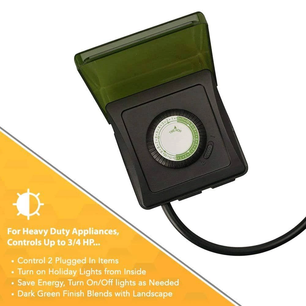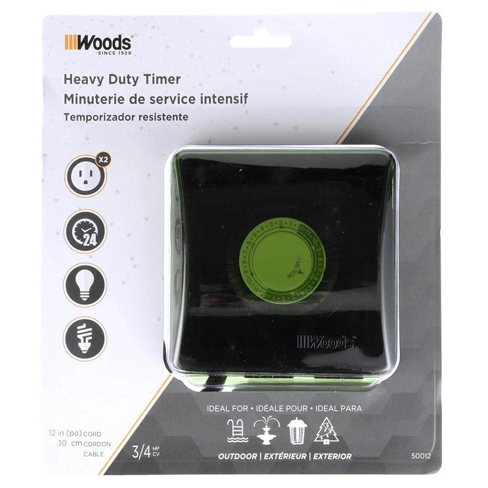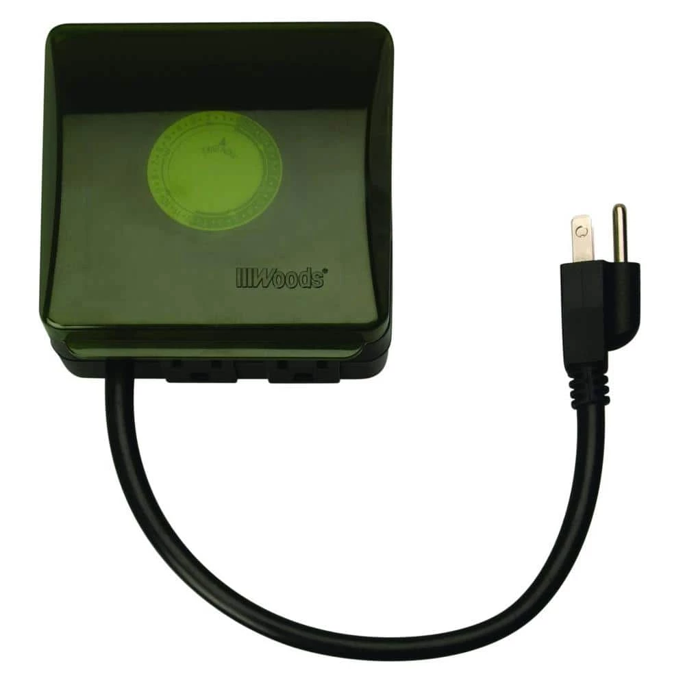 The Outdoor Mechanical 3-Conductor 2-Outlet Timer turns outdoor appliances on and off at set times. Heavy duty outdoor appliances require a timer that can handle the load. This 3/4 horsepower (15FLA, 90LRA) timer is specially designed to work with portable pools, spa filter pumps, patio or garden fountains, car heating accessories, outdoor lighting and other heavy duty outdoor appliances. Use a timer to control your pond lights, pump or fountain. The forest green blends into landscapes and gardens; place this discreet timer on your patio or next to bushes. A semi-transparent lid protects the pin dial from damage and weather resistant housing is designed for extreme weather conditions. The Outdoor Mechanical 3-Conductor 2-Outlet Timer is ideal for outdoor lighting and seasonal decorations. It can be set for multiple on/off events, which maximizes energy savings and controls electricity costs by only using power when it’s needed. This plug-in timer provides up to 24 on/off settings per day and the cycle repeats every 24 hours. Easy to set in 30 minute intervals with never-lose segment pins that can’t be removed or lost. Use the manual override button to turn the timer on or outlet on, so you don’t have to delete any preprogrammed settings. This timer is compatible with compact fluorescent lighting and is CSA certified for quality assurance. The Woods brand of timers and home controls bring simplicity to your life, by maximizing convenience, security and energy savings.