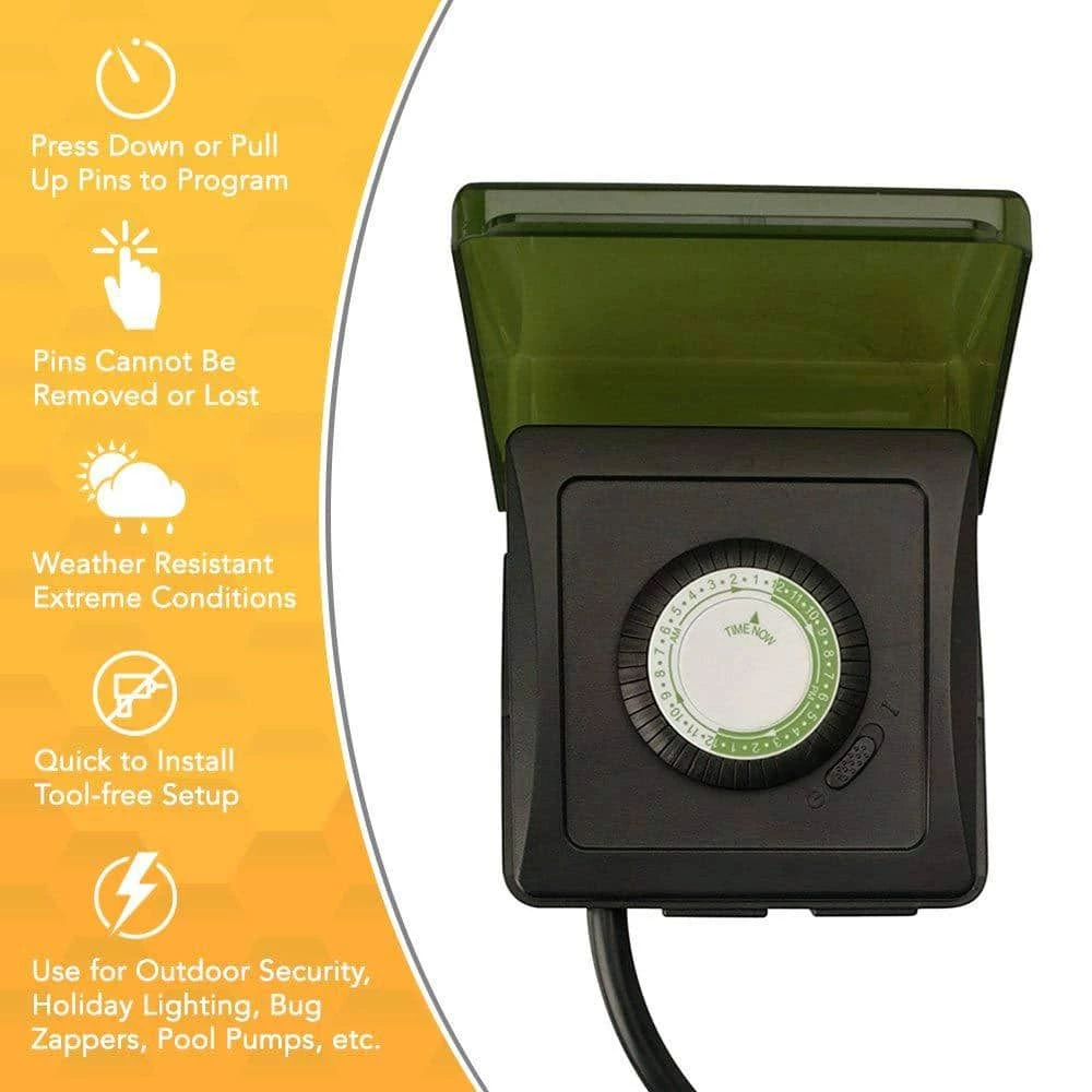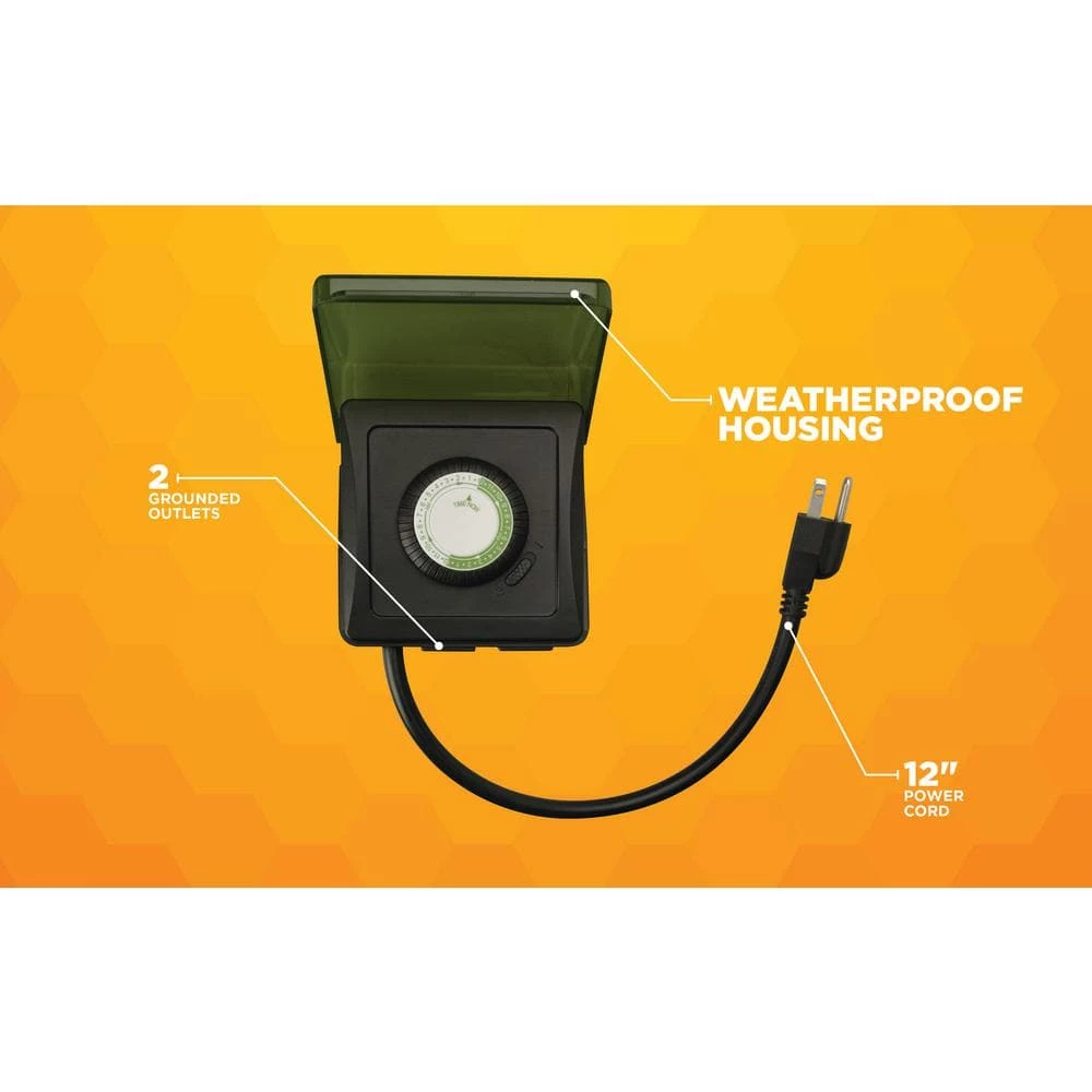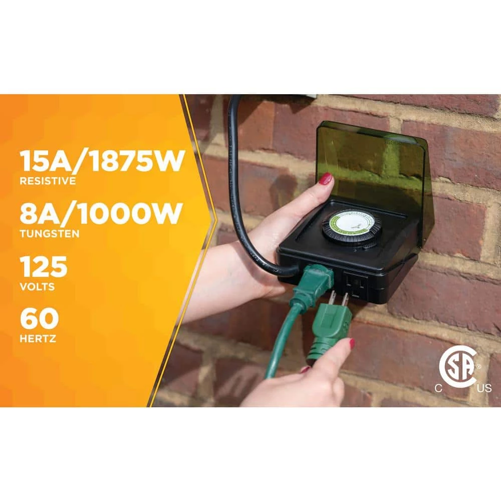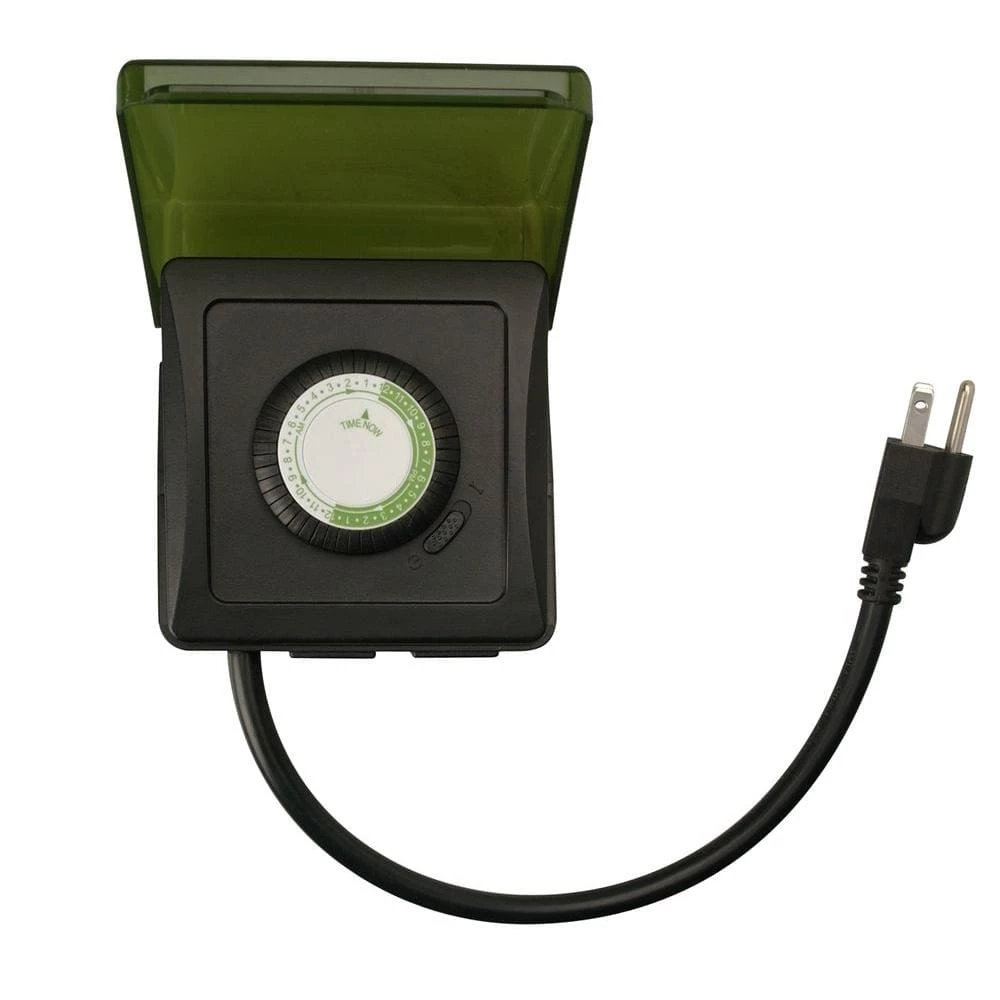 The Outdoor Mechanical 3-Conductor 2-Outlet Timer turns outdoor appliances on and off at set times. Heavy duty outdoor appliances require a timer that can handle the load. This 3/4 horsepower (15FLA, 90LRA) timer is specially designed to work with portable pools, spa filter pumps, patio or garden fountains, car heating accessories, outdoor lighting and other heavy duty outdoor appliances. Use a timer to control your pond lights, pump or fountain. The forest green blends into landscapes and gardens; place this discreet timer on your patio or next to bushes. A semi-transparent lid protects the pin dial from damage and weather resistant housing is designed for extreme weather conditions. The Outdoor Mechanical 3-Conductor 2-Outlet Timer is ideal for outdoor lighting and seasonal decorations. It can be set for multiple on/off events, which maximizes energy savings and controls electricity costs by only using power when it’s needed. This plug-in timer provides up to 24 on/off settings per day and the cycle repeats every 24 hours. Easy to set in 30 minute intervals with never-lose segment pins that can’t be removed or lost. Use the manual override button to turn the timer on or outlet on, so you don’t have to delete any preprogrammed settings. This timer is compatible with compact fluorescent lighting and is CSA certified for quality assurance. The Woods brand of timers and home controls bring simplicity to your life, by maximizing convenience, security and energy savings.