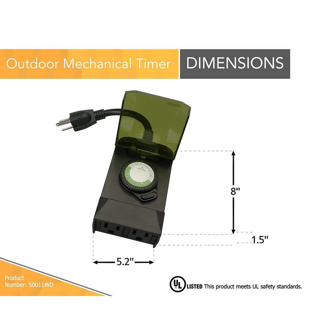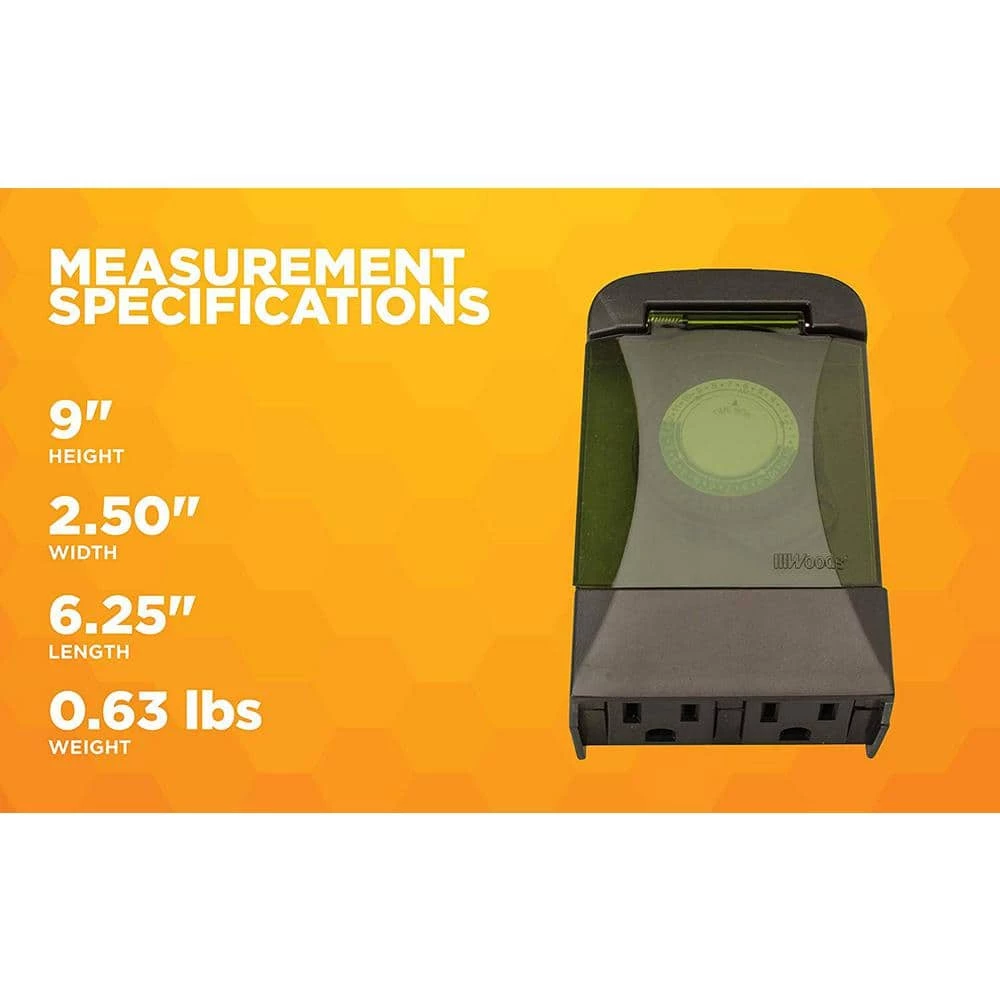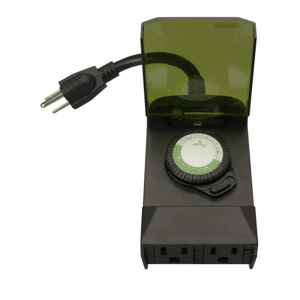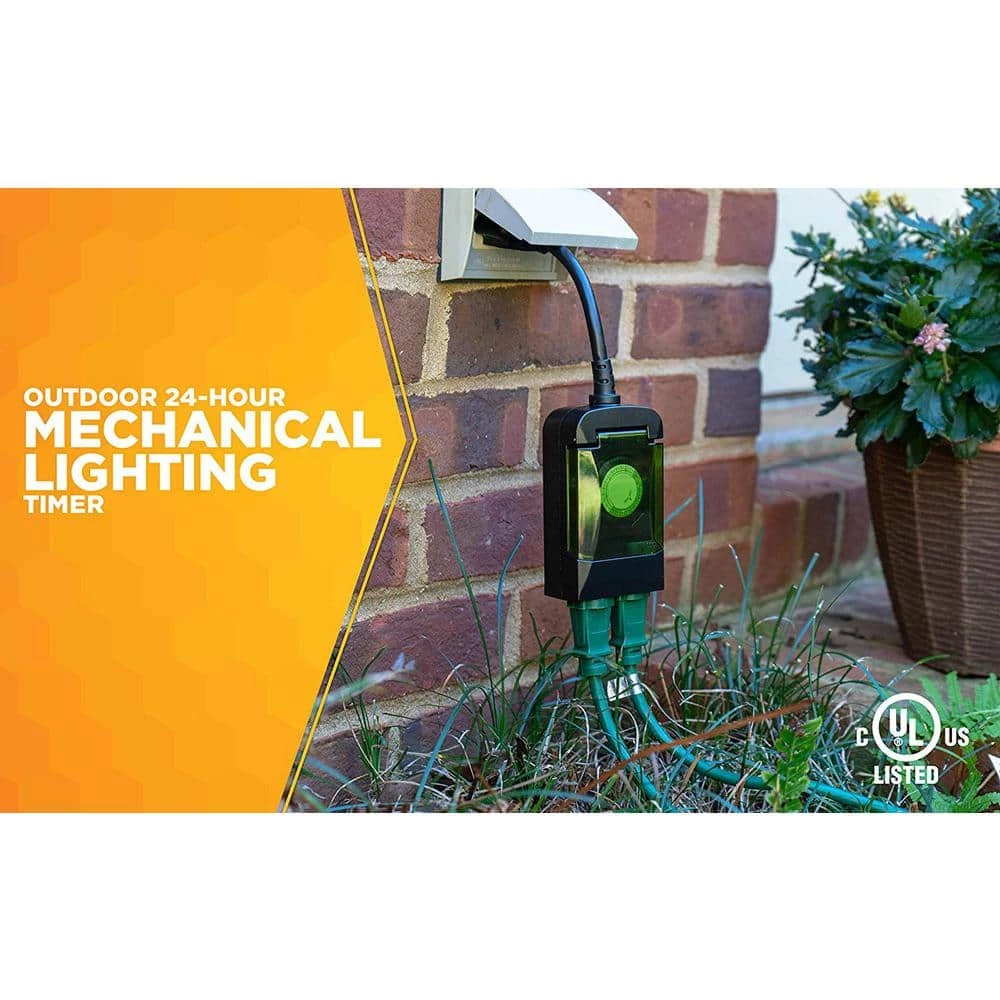The Outdoor Mechanical 3-Conductor 2-Outlet Timer turns outdoor lighting on and off at set times. Looking for a way to conveniently manage some landscape lighting or an outdoor animated holiday display? Plug it into this timer, choose your settings walk away. This leaves you free to enjoy your yard without having to remember to turn the lights on and off. Saves money too, by only turning lights or decorations on after dark and programming them to go off automatically so they don’t stay on all night. The forest green blends into landscapes and gardens; place this discreet timer on your patio or next to bushes. A semi-transparent lid protects the pin dial from damage and weather resistant housing is designed for extreme weather conditions. The Outdoor Mechanical 3-Conductor 2-Outlet Timer can be set for multiple on/off events, which maximizes energy savings and controls electricity costs by only using power when it’s needed. This plug-in timer provides up to 24 on/off settings per day and the cycle repeats every 24 hours. Easy to set in 30 minute intervals with never-lose segment pins that can’t be removed or lost. Use the manual override button to turn the timer on or outlet on, so you don’t have to delete any preprogrammed settings. This timer is compatible with compact fluorescent lighting and is CSA certified for quality assurance. The Woods brand of timers and home controls bring simplicity to your life, by maximizing convenience, security and energy savings.