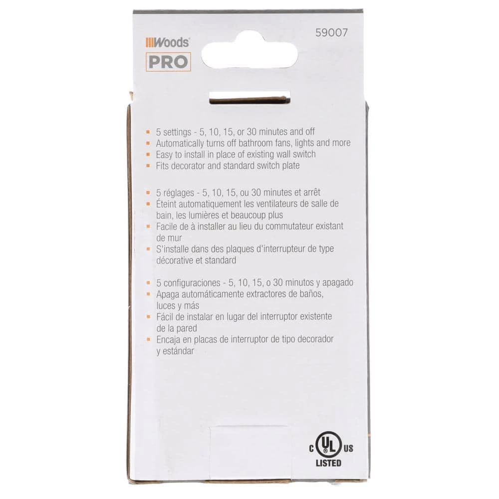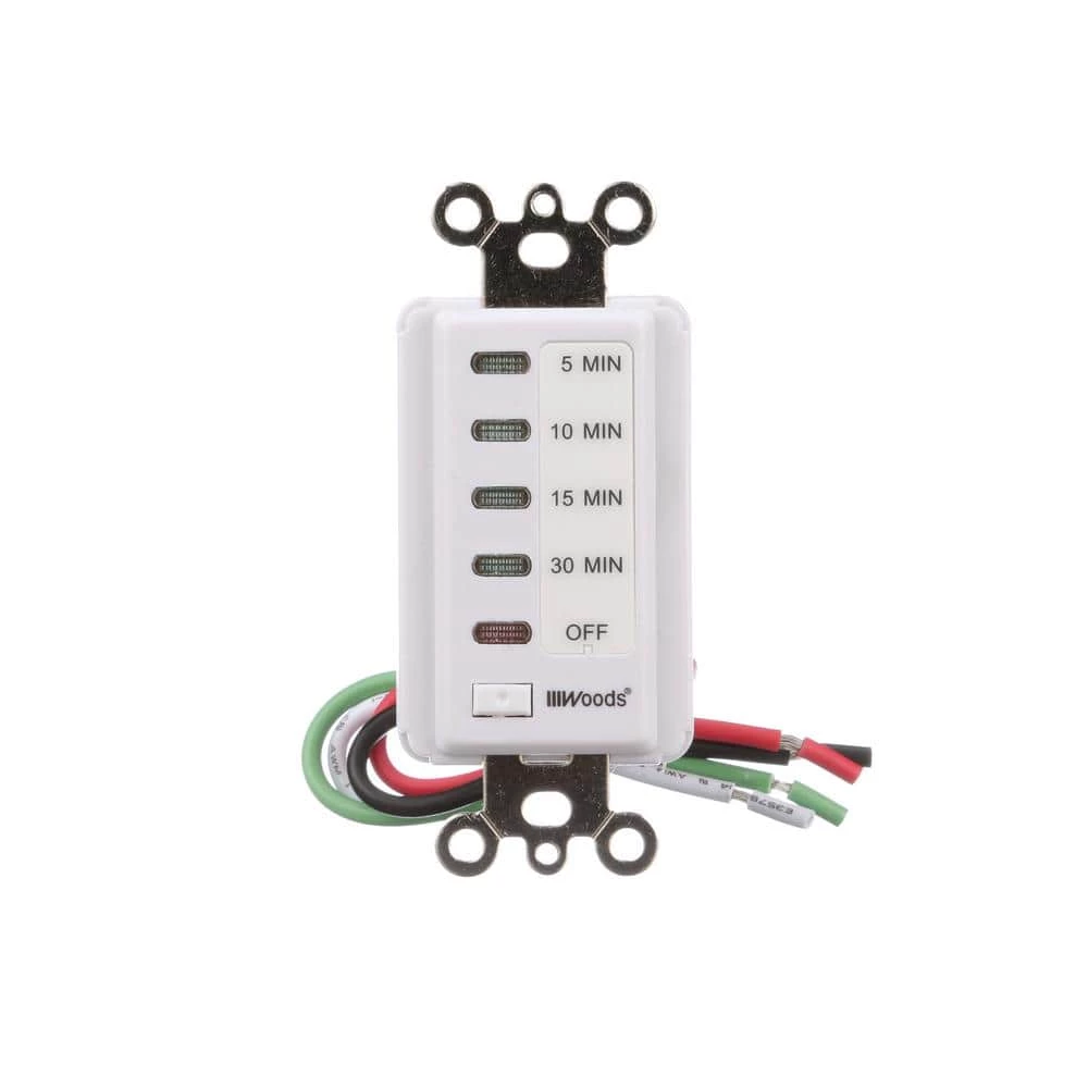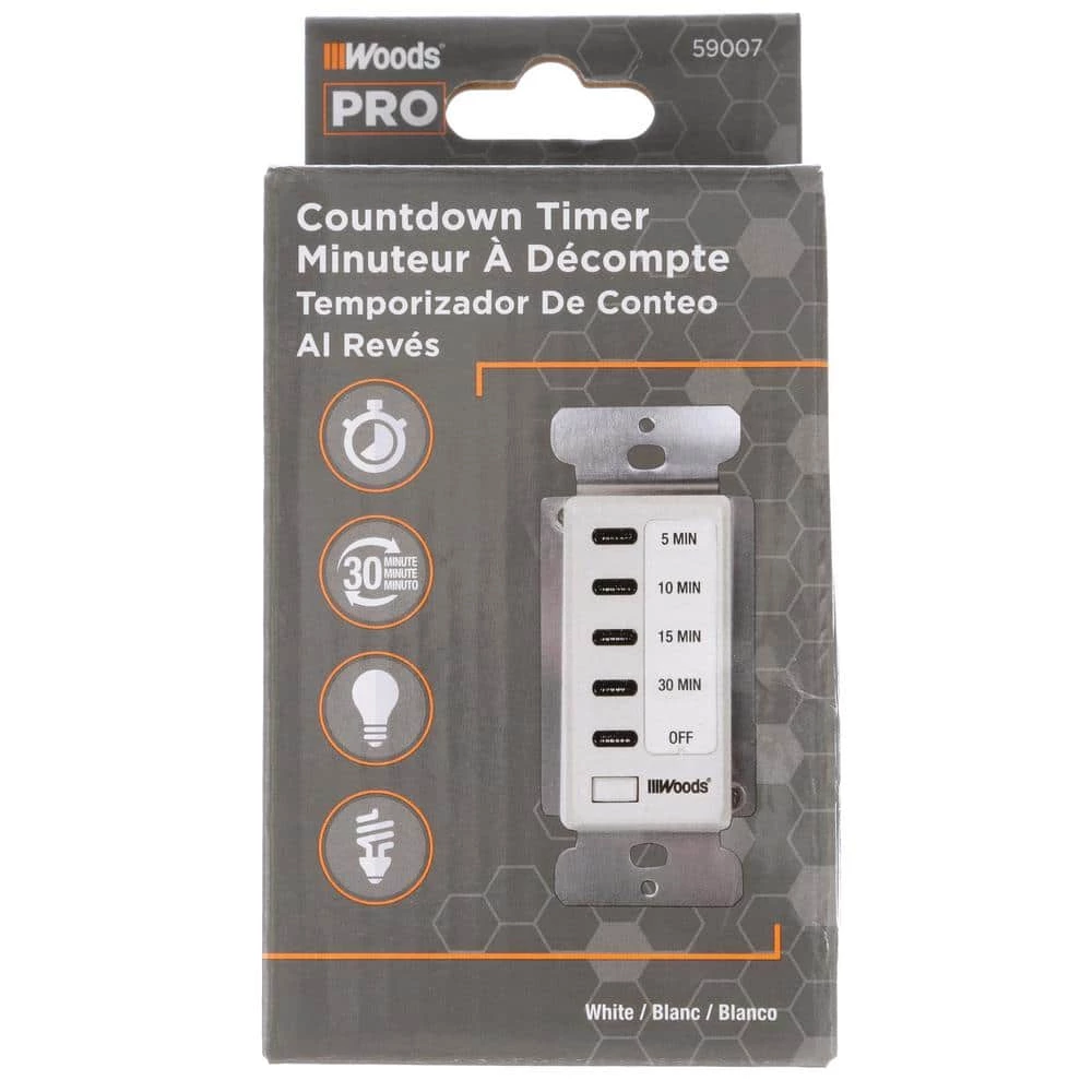 The In-Wall Digital Countdown Timer automatically turns lighting or devices off after a selected time. Perfect for indoor/outdoor lighting, exhaust fans, heat lamps, or low-traffic areas. With a single push button control, select from 5, 10, 15, or 30 minutes before the wired in light or device automatically shuts off. An LED light will illuminate next to the amount of time specified. To override the countdown function, continue to press the push button control until the LED is illuminated next to the OFF button. Installs conveniently in single or multi-Gang electrical wall boxes and easily replace SPST toggle switches. Fits any single or multi-Gang decorator switch plate. With the In-Wall Digital Countdown Timer you can leave the bathroom exhaust fan on without having to remember to turn it off later. Countdown timers are an easy way cut down on wasted energy use since lights and fans can be timed to only be on when needed. This timer is compatible with compact fluorescent lighting, LED bulbs and cUL listed for quality assurance. The Woods brand of timers and home controls bring simplicity to your life, by maximizing convenience, security and energy savings.