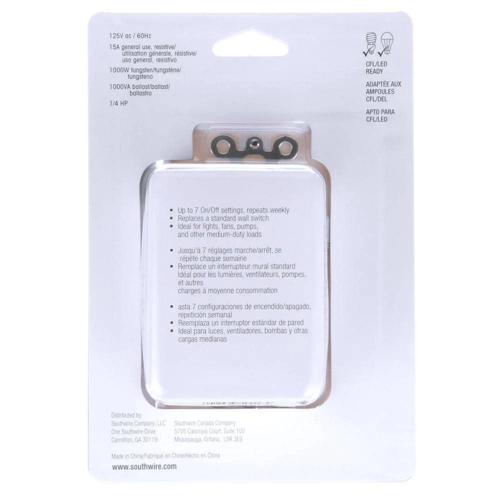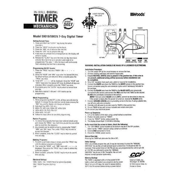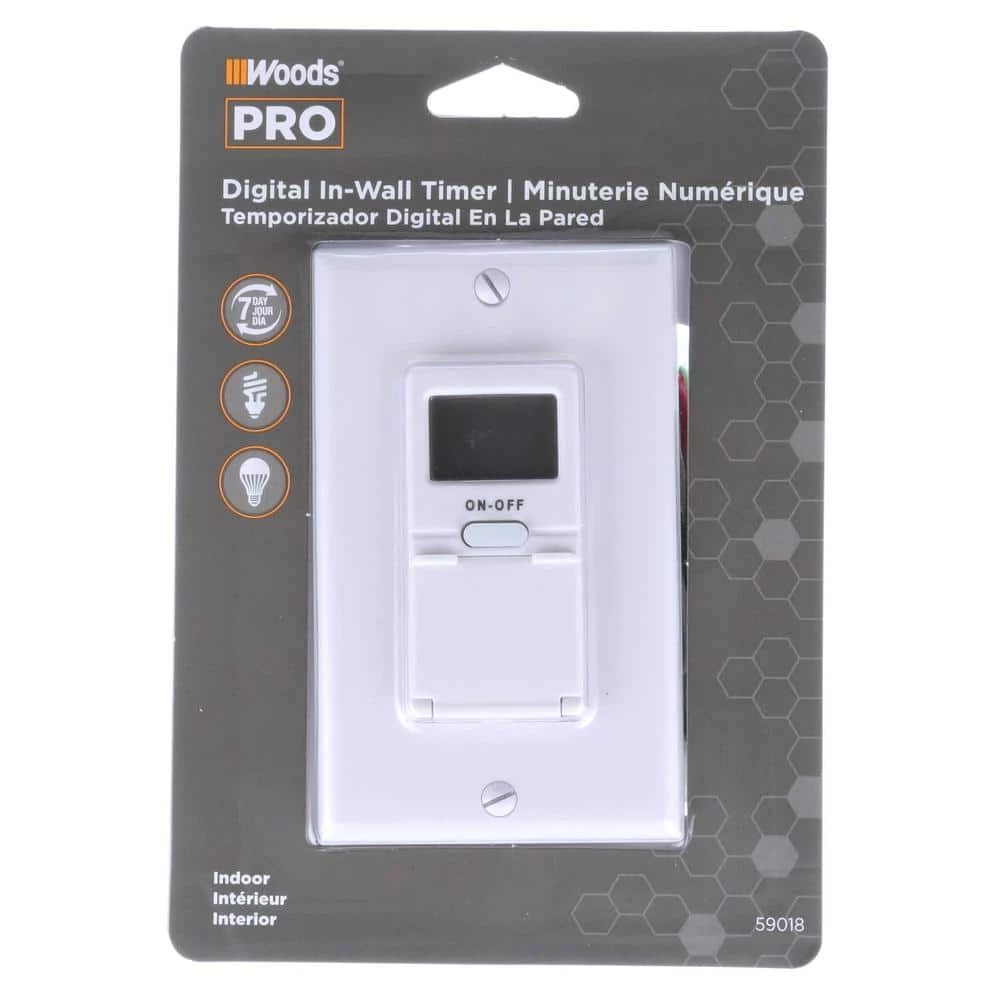 The In-Wall Digital 7-Day Programmable Timer is great for overhead lighting, ceiling fans, porch lighting, feeding or watering equipment. Programming can be set for multiple on/off events that automate everyday tasks and reduce utility costs, with up to 7 on/off settings per week and set weekdays different than weekends. As day turns to night, program the living room lights to come on while you’re still at the office, giving your home that lived in look. The override switch is easily accessible from the front of the timer so you can turn lights on or off at any time without affecting the set schedule. Installs conveniently in single or multi-Gang electrical wall boxes and easily replace SPST toggle switches. Fits any single or multi-Gang decorator switch plate. Features include a self-recharging battery back-up, in case of power failure. The In-Wall Digital 7-Day Programmable Timer can be set to turn on your porch lights at dark so you can safely walk to your front door and enter a well-lite, warm and inviting home. This timer is compatible with compact fluorescent lighting, LED bulbs and cUL listed for quality assurance. The Woods brand of timers and home controls bring simplicity to your life, by maximizing convenience, security and energy savings.