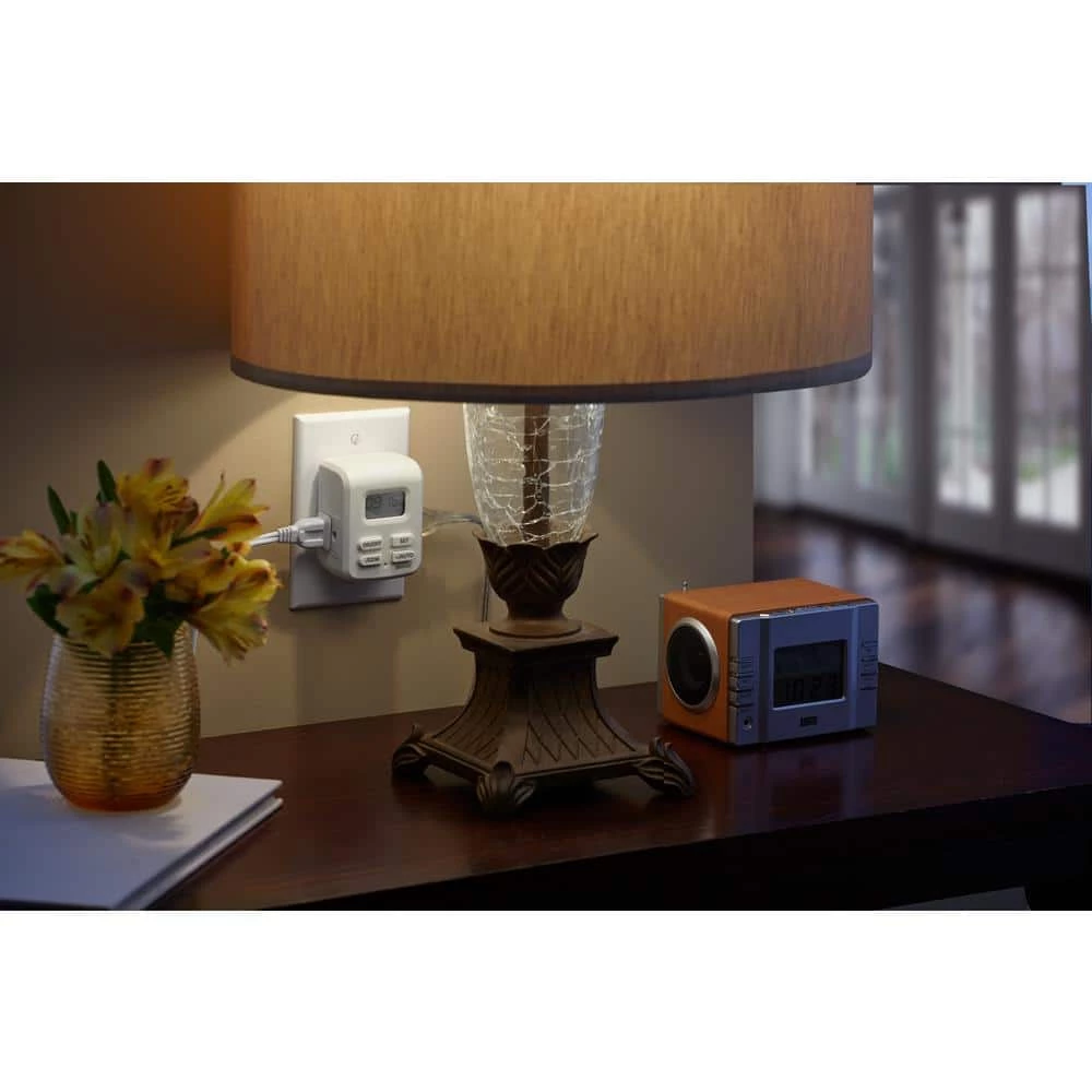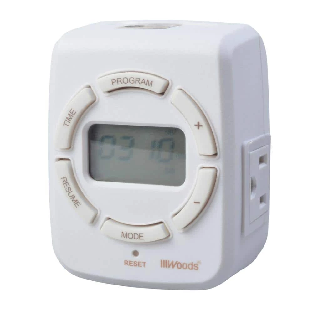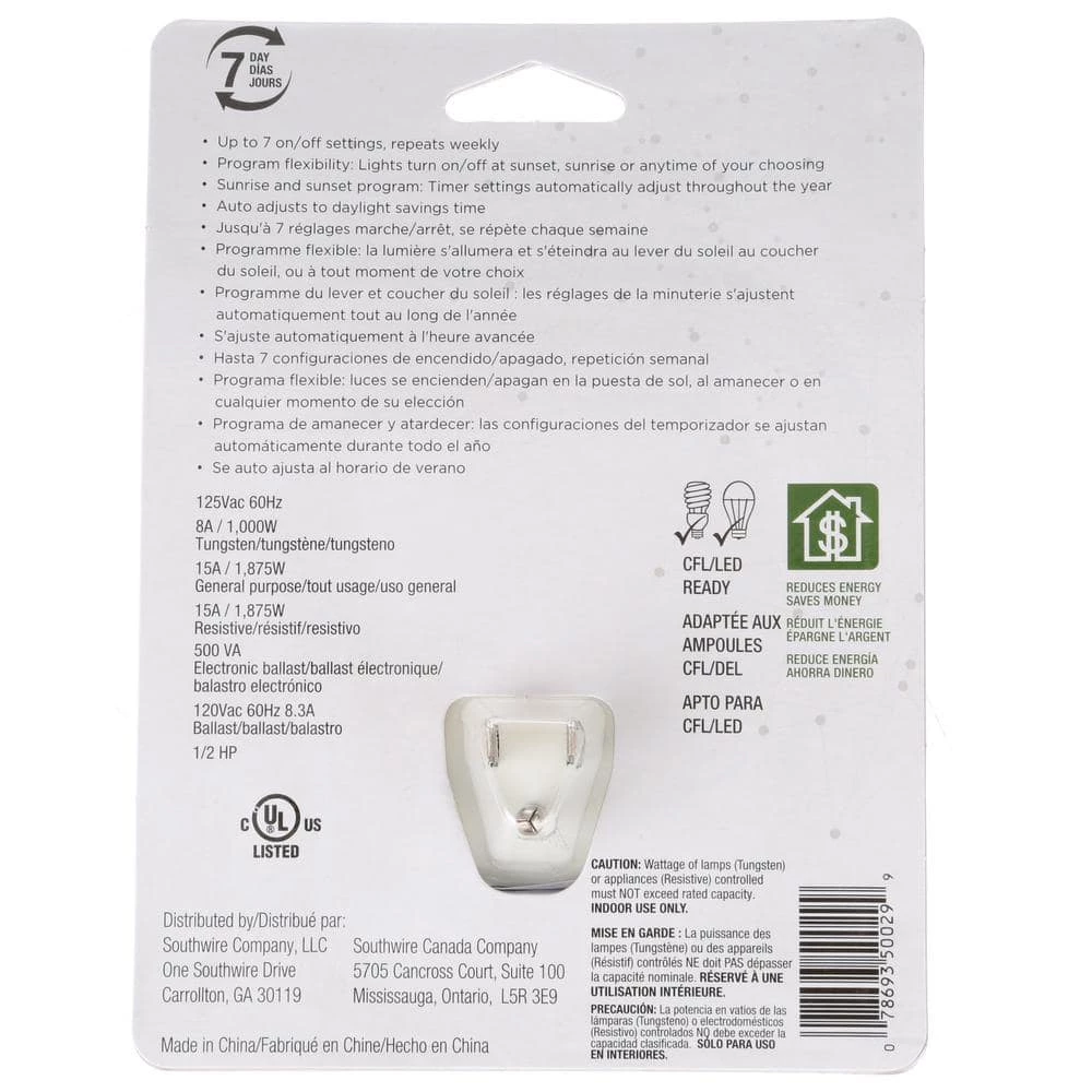 Woods 50029 Indoor 7-Day Astronomical Timer with Sun Tracking Technology, 2 Grounded Outlets. The Woods brand of timers with sun tracking technology can automatically turn lights on at sunset and off at sunrise. The sunrise and sunset program automatically adjusts throughout the year, so as the days get shorter the timer turns the lights on earlier. Or customize programming options turn lights on/off at sunset, sunrise or anytime of your choosing. For example, program the table lamp to turn on at sunset and off at 11:00 each giving your home that lived in look while your away. These sun tracking technology timers are part of the Tru Living Collection of timers that compliment any decor with warm neutrals which bring sophistication and style while maximizing convenience, safety and energy savings. Rated for 125V AC, 60 Hz 15A Resistive/15A General Use/1000W Tungsten 500 VA Electronic Ballast/120Vac 60Hz 8.3A Ballast/Controls up to 1/2H cUL Listed. Up to 7 on/off settings, repeats weekly. Includes two 3-conductor grounded outlets. Programming capabilities include: Lights turn on/off at sunset, sunrise or anytime of your choosing OR Sunrise and sunset program: Timer settings automatically adjust throughout the year. The unit will auto adjust to daylight savings time. User may program each day different or weekdays different than weekends. Convenient setting for security while your away on vacations or traveling. Compatible with CFL, LED & incandescent lighting, cUL Listed.
