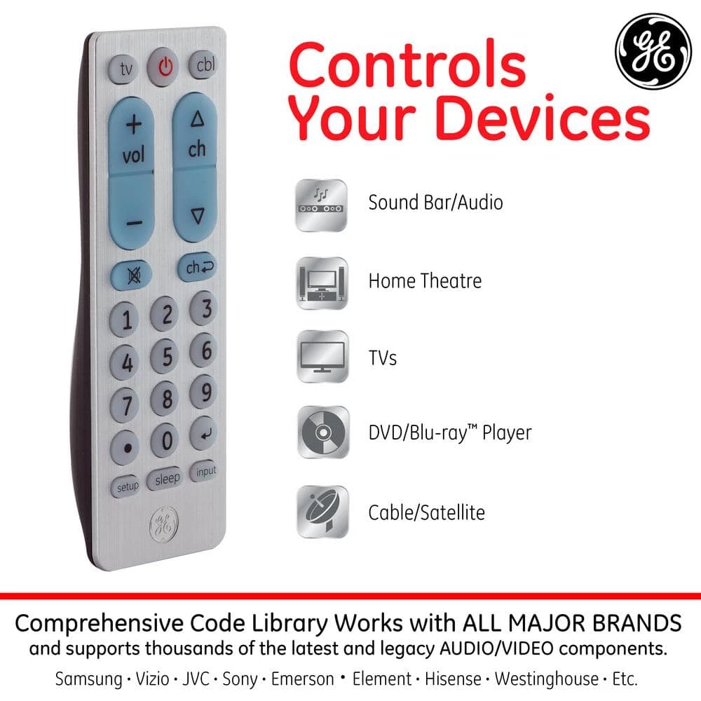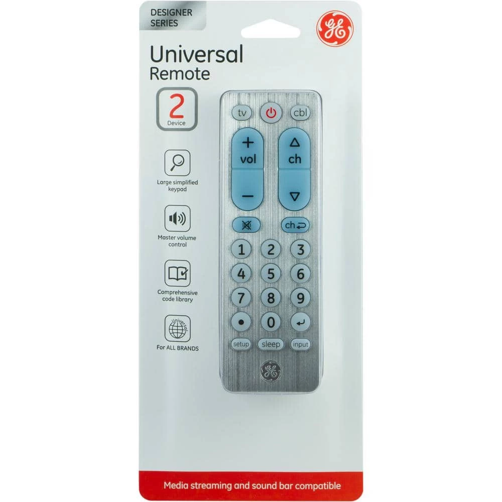 Consolidate control with a GE Designer Series 2-Device Universal Remote. No longer worry about keeping track of multiple controllers – the remote is designed to control up to two audio/video devices, such as your TV, cable, Blu-ray/DVD player, DVR, satellite, audio, soundbars and streaming media players like Roku and Apple TV. Eliminate the hassle of programming more than one controller and enjoy the simple, user friendly setup. It is preprogrammed to immediately operate Samsung TVs, and a comprehensive code library lets you program the remote to control all major brands of compatible equipment. The universal remote has an elegant brushed silver finish and features master volume control, which allows you to adjust the volume regardless of which device you’re operating. For added convenience, the large, simplified keyboard makes buttons easy to see. Menu navigation buttons guide you through the menu on DVRs and set top boxes, and the DOT button gives you easy access to sub-channels such as 4.2. The instruction manual and Code library list are included, along with a video link to an easy-to-follow online setup video. The remote requires two AAA batteries, which are not included. Streamline Your home entertainment system with the GE 2-Device Universal Remote.