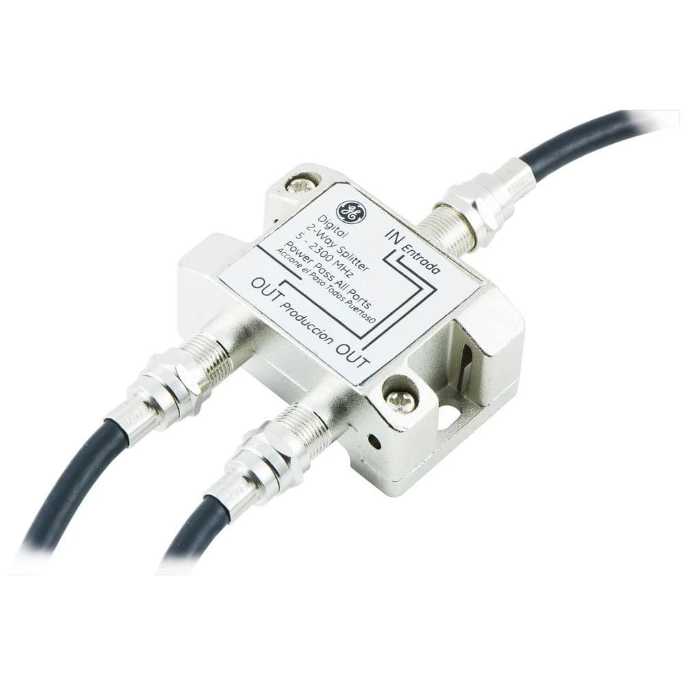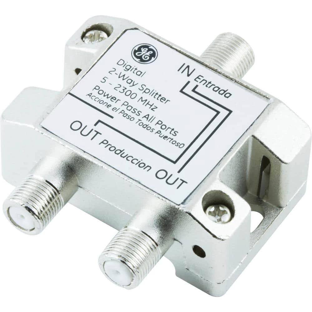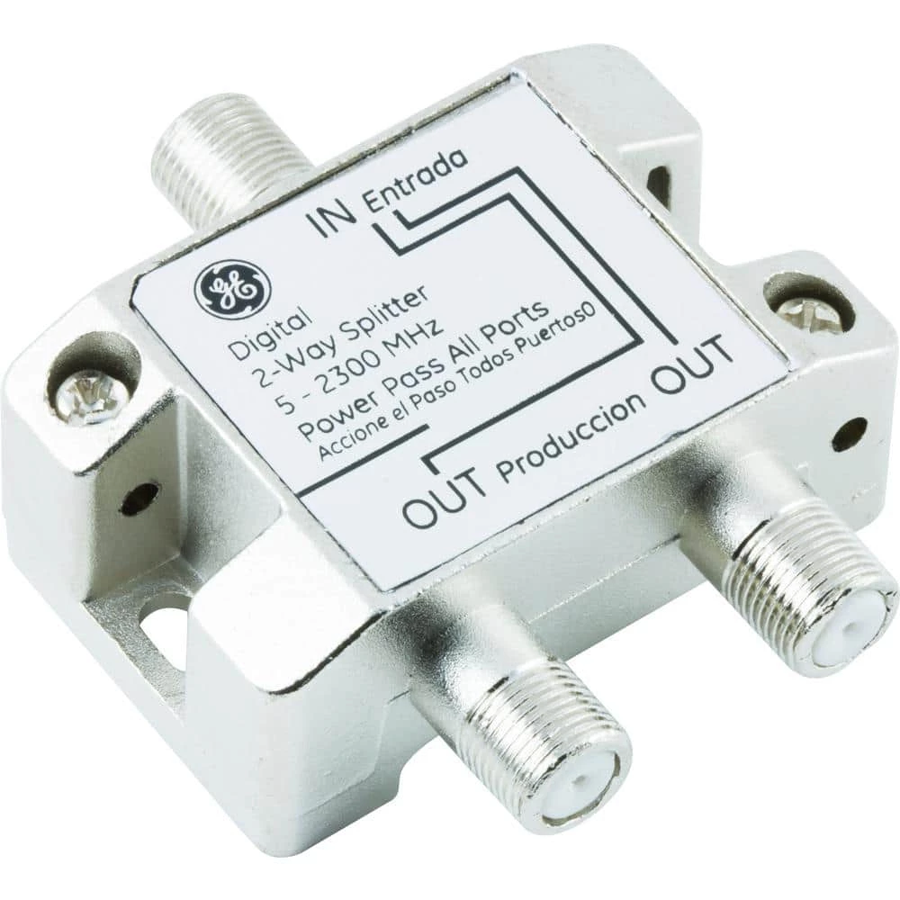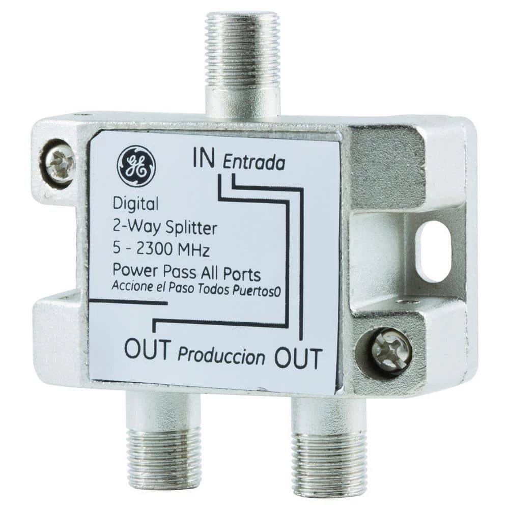 Expand your entertainment viewing options with the GE Digital 2-Way Coax Splitter. Whether you access your entertainment through a TV antenna, cable or satellite subscription or other device, this handy splitter lets you easily deliver the digital signal to multiple TVs for the best in high-definition entertainment. This coax splitter is designed to evenly distribute one digital signal to support up to two devices, such as TVs, DVRs, Blu-ray/DVD players, cable boxes and more. It transfers audio and video for all brands of electronics using F-type connectors and is capable of handling frequencies of 5-2300MHz. Installation is easy. Simply use the clearly labeled, screw-on input and output jacks. Screw the coax connector from the signal source that you wish to distribute, such as your TV antenna, cable or satellite connection, onto the coax jack labeled “in” on the splitter. Screw in the coax connectors for the cables running to the TV or other device to any of the coax jacks labeled “out.” The compact design fits easily in tight spaces and integrates seamlessly with existing hardware. Experience greater entertainment with the GE Digital 2-Way Coax Splitter.