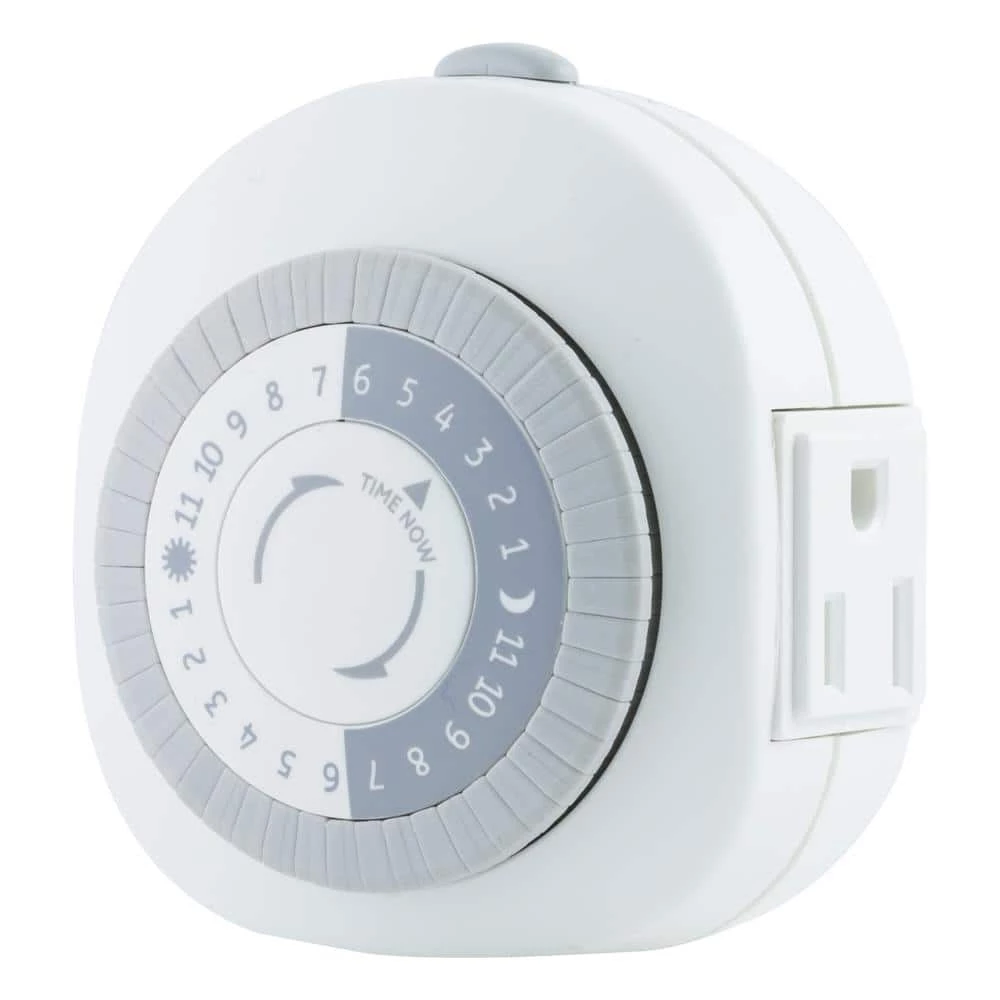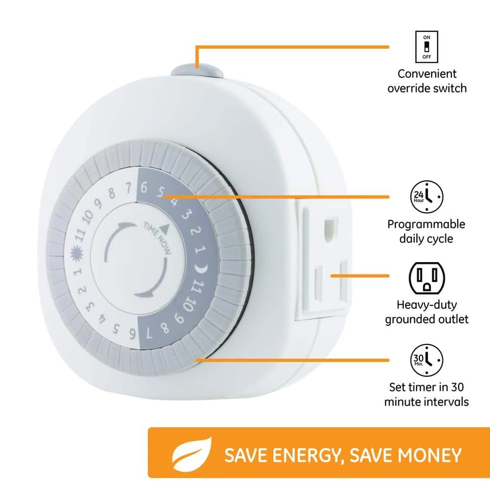Help keep your energy costs low and feel secure with the single-outlet GE Heavy Duty Mechanical Timer. Effective with any electrical device, the timer turns your devices on and off with an easily programmable push of a pin. Just push down the pins (ensuring all pins are pulled up first), each representing a 30-minute interval, for the times you want your electrical device to stay on. Perfect for controlling lamps, seasonal lighting, or deterring crime when you are away. For indoor use only.