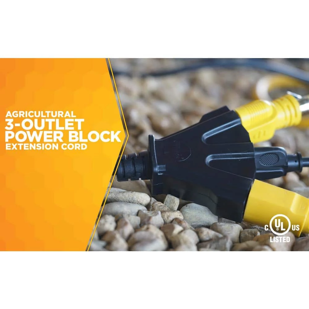 This 14/3 SJTOW Agricultural Extension Cord with 3-Outlet Power Block is intended for use on farms and ranches. The vinyl jacket is chemical, oil and moisture resistant. Reinforced blades help prevent accidental bending or breaking. The cord remains flexible at all times in all temperatures.