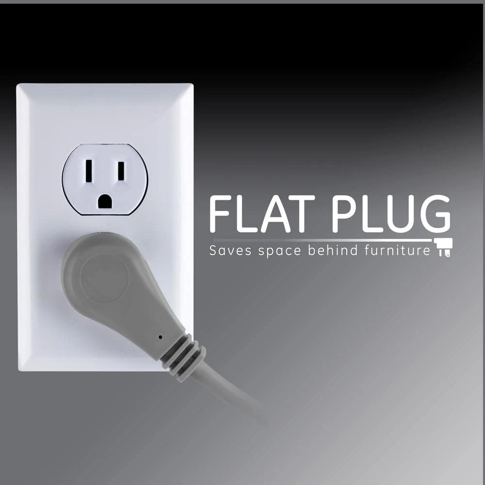 - Flat plug extension cord – keep furniture and media close to the wall with the low-profile flat plug at the end of this power strip; the angled plug allows for this surge protector to be plugged into the receptacle without blocking the other outlet