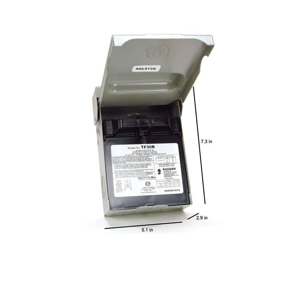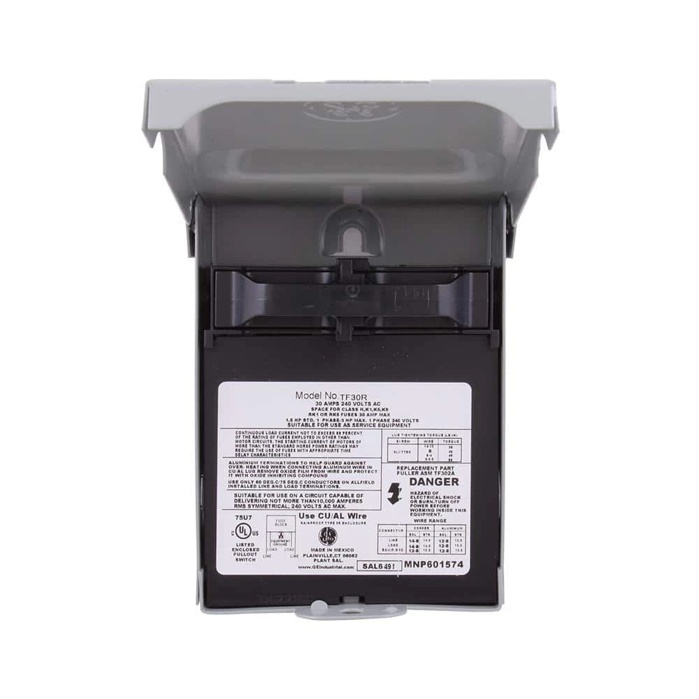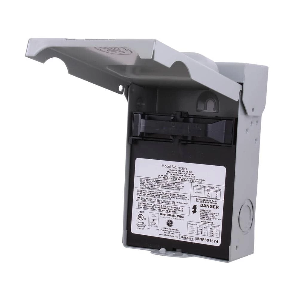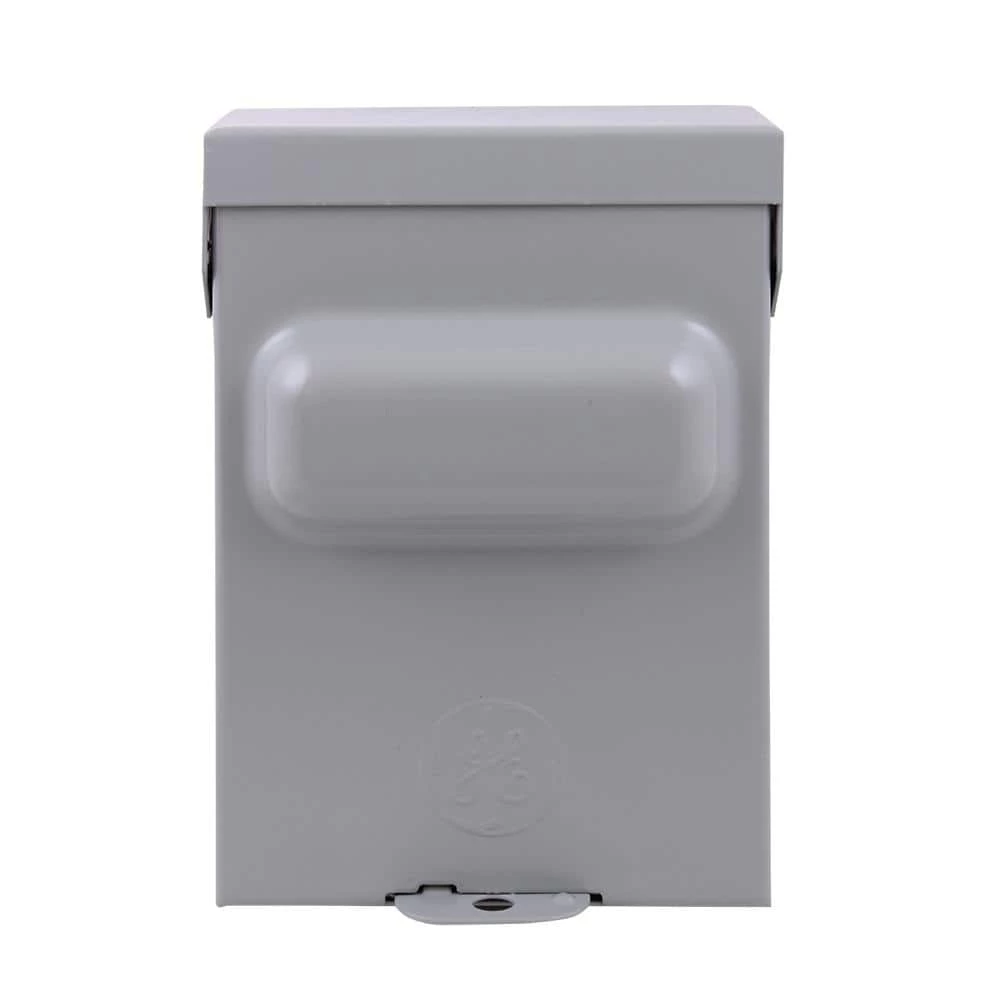 The GE 30 Amp 120/240-Volt 240-Watt Fused (requires 2 fuses installed on the back side of the puller). AC Disconnect has a NEMA 3R-rated steel enclosure that is both rust- and corrosion resistant for outdoor use. This safety switch is intended to disconnect power from an air-conditioning unit and uses lug wire range AWG #14 – 3 copper/aluminum. This single-phase disconnect is ANSI certified and UL listed with a maximum load of 240-Volt.