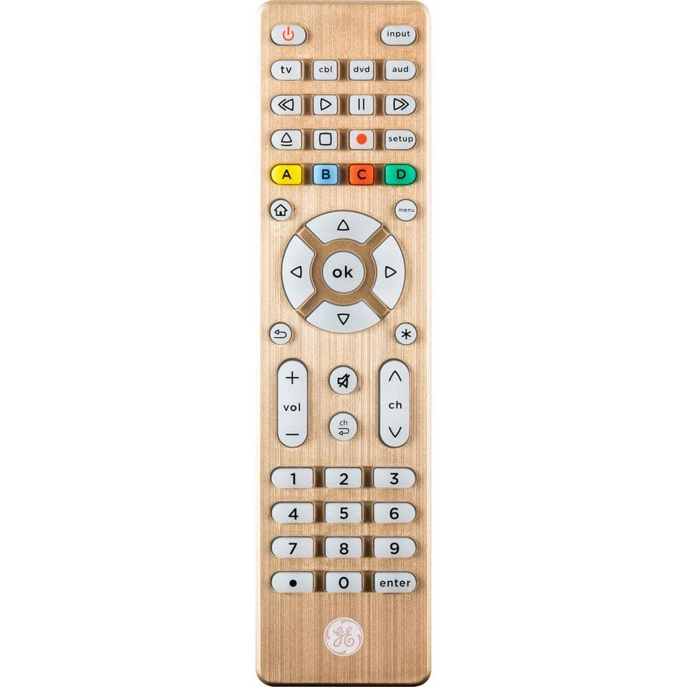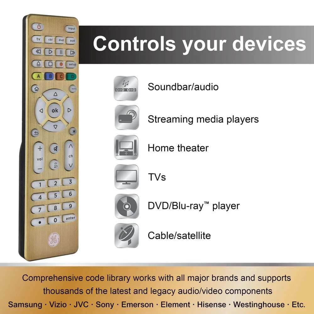 Consolidate control with the GE-branded 4-Device, Backlit Universal Remote in an elegant, brushed gold finish. No need to worry about keeping track of multiple controllers – this remote can operate up to 4 devices, including your TV, Blu-ray/DVD player, streaming media player, cable, satellite, sound bar and more. Eliminate the hassle of managing multiple remotes as you take charge of your home entertainment system. Preprogrammed for immediate use with Samsung TVs and Roku boxes, this remote offers simple, user friendly setup with your choice of automatic code search or direct code entry. The master volume control feature allows you to adjust the audio regardless of which device is being used. Full backlighting with blue LEDs gives you enhanced visibility when operating your remote in low-light settings. for added convenience, this remote includes a Blu-ray/DVD player open/close button as well as advanced DVR functions, simple menu navigation and a dot button for sub-channel access. Organize your entertainment with this GE-branded 4-Device, Backlit Universal Remote.