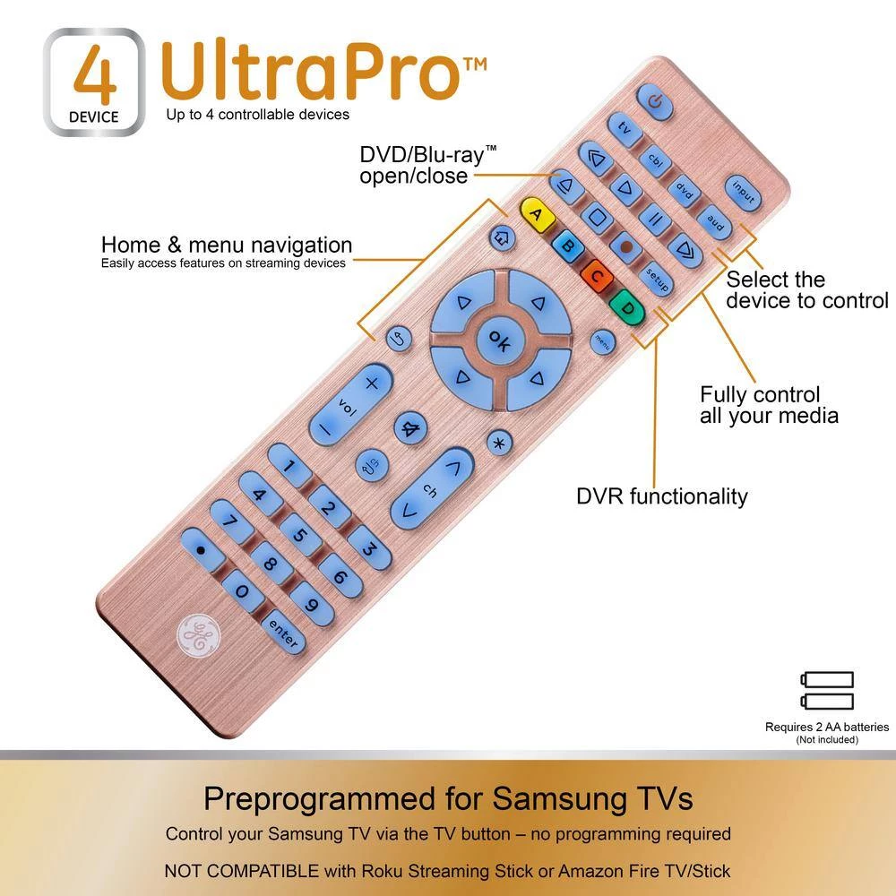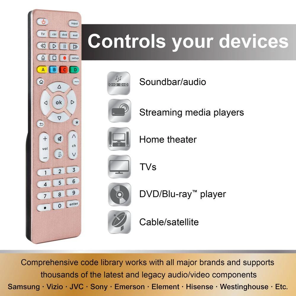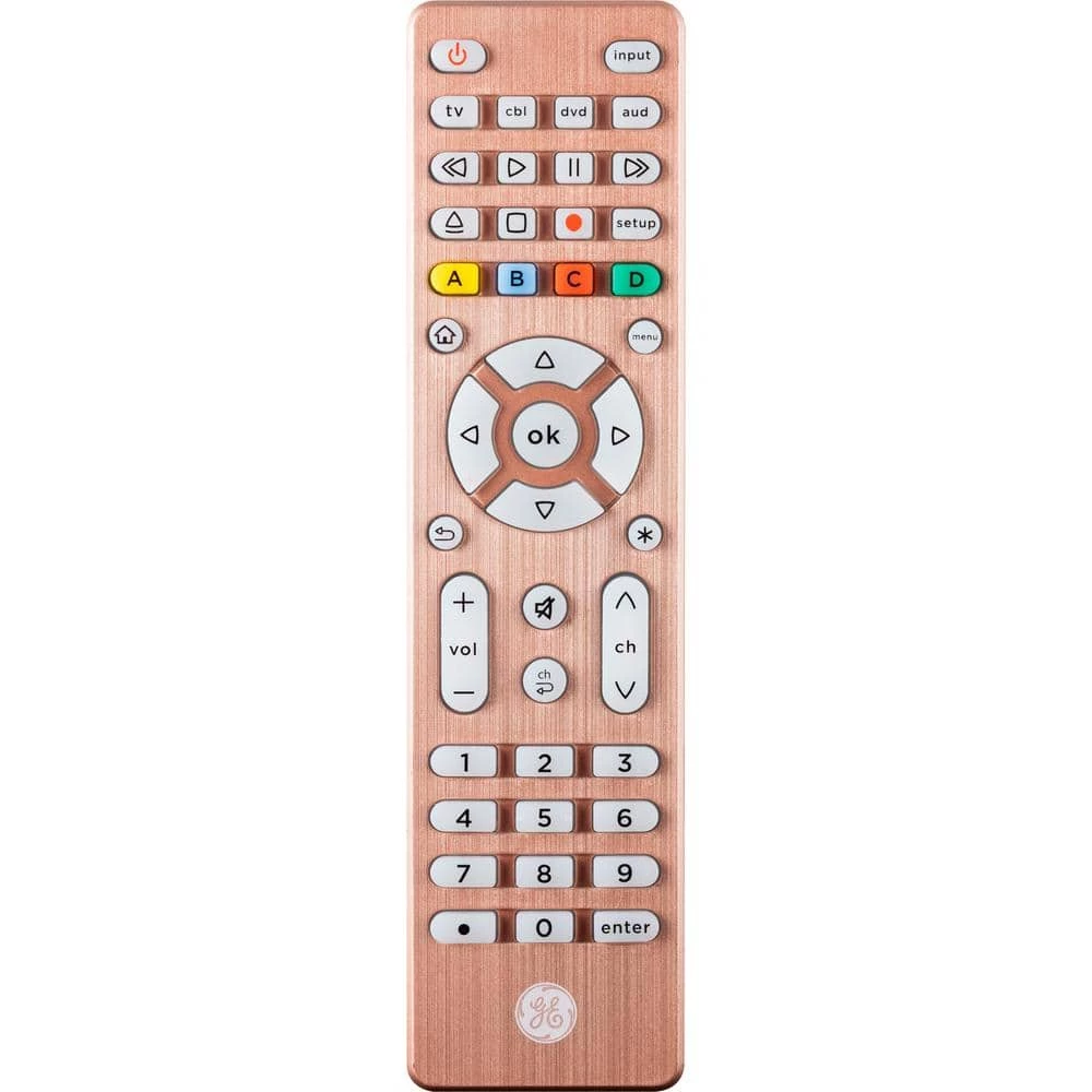 Consolidate control with the GE-branded 4-Device, Backlit Universal Remote in a beautiful, brushed rose gold finish. No need to worry about keeping track of multiple controllers – this remote can operate up to 4 devices, including your TV, Blu-ray/DVD player, streaming media player, cable, satellite, sound bar and more. Eliminate the hassle of managing multiple remotes as you take charge of your home entertainment system. Preprogrammed for immediate use with Samsung TVs and Roku boxes, this remote offers simple, user friendly setup with your choice of automatic code search or direct code entry. The master volume control feature allows you to adjust the audio regardless of which device is being used. Full backlighting with blue LEDs gives you enhanced visibility when operating your remote in low-light settings. for added convenience, this remote includes a Blu-ray/DVD player open/close button as well as advanced DVR functions, simple menu navigation and a dot button for sub-channel access. Organize your entertainment with this GE-branded 4-Device, Backlit Universal Remote.