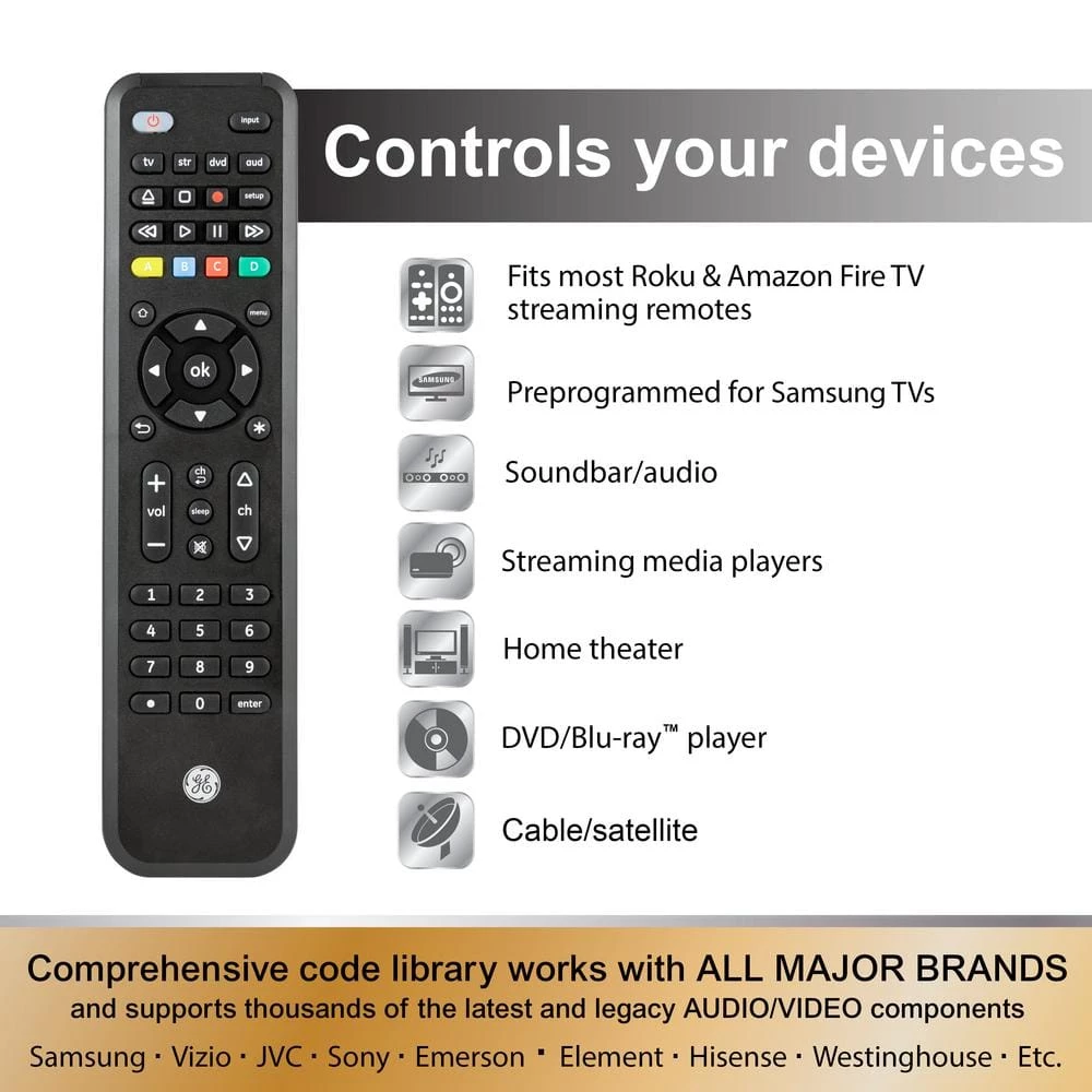Consolidate control of all your home entertainment equipment with the patent-pending GE-branded 4-Device Universal Remote Companion for Roku or Fire TV Programmable for up to 4 devices, this full-feature universal remote includes an adaptable compartment to securely house your Roku or Fire TV streaming remote while giving you complete functionality and control. Compatible with most Roku and Fire TV streaming remotes and programmable with all major brands, this universal remote supports thousands of the latest audio/video devices so you can easily program your TV Blu-ray/DVD player, cable, satellite, soundbar and more. Additionally, this remote is preprogrammed for immediate use with Samsung TV. Master volume control lets you adjust the volume regardless of which device is being used for your audio. And, when you’re ready to stream your favorite movies and shows, your fully functional Roku or Fire TV remote is already in hand. Experience unmatched control over all your home entertainment devices with the GE-branded 4-Device Universal Remote Companion for Roku and Fire TV.