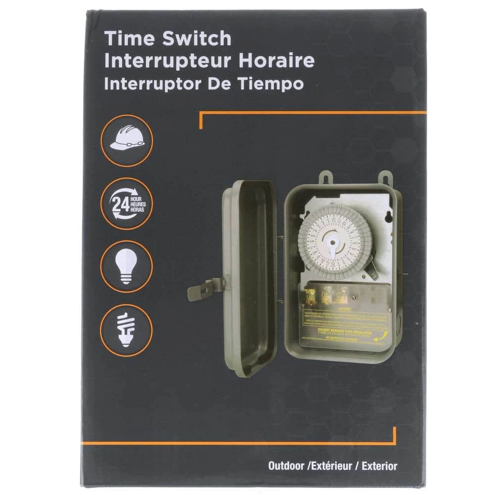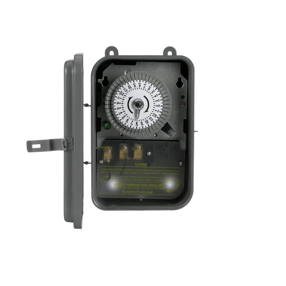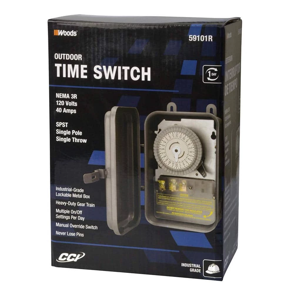 The 120-Volt, SPST, 40 Amp, 24 Hour Mechanical Time Switch, turns heavy-duty appliances on and off at set times. Set multiple on/off settings for your indoor and outdoor lighting, air conditioning, fans, blowers, pumps, and other commercial, industrial and residential applications. Features a 40 Amp contact switch with robust motor and heavy-duty gear train that is enclosed in an outdoor rated, NEMA 3R, industrial-grade lockable box for safety and durability. Has up to 24 on/off settings per day for flexible programming, with segment pins that are permanently attached so they won’t get lost. Programming can be set in 30 minute intervals for multiple on/off events, which maximizes energy savings and controls electricity costs by only using power when it’s needed. Also includes a manual override lever which temporarily suspends switch operation without affecting the set schedule. The Single Pole, Single Throw (SPST) indicates the mechanical timer can control one circuit (like one set of lights). The 120-Volt, SPST, 40 Amp, 24 Hour Mechanical Time Switch is CSA Certified for quality assurance and meets UL standard 917. Rated for most loads up to 2-horsepower (24FLA), 40 Amp resistive, general use, and tungsten from 120-Volt providing direct 24 hour time switch control. The Woods brand of timers and home controls bring simplicity to your life, by maximizing convenience, security and energy savings.