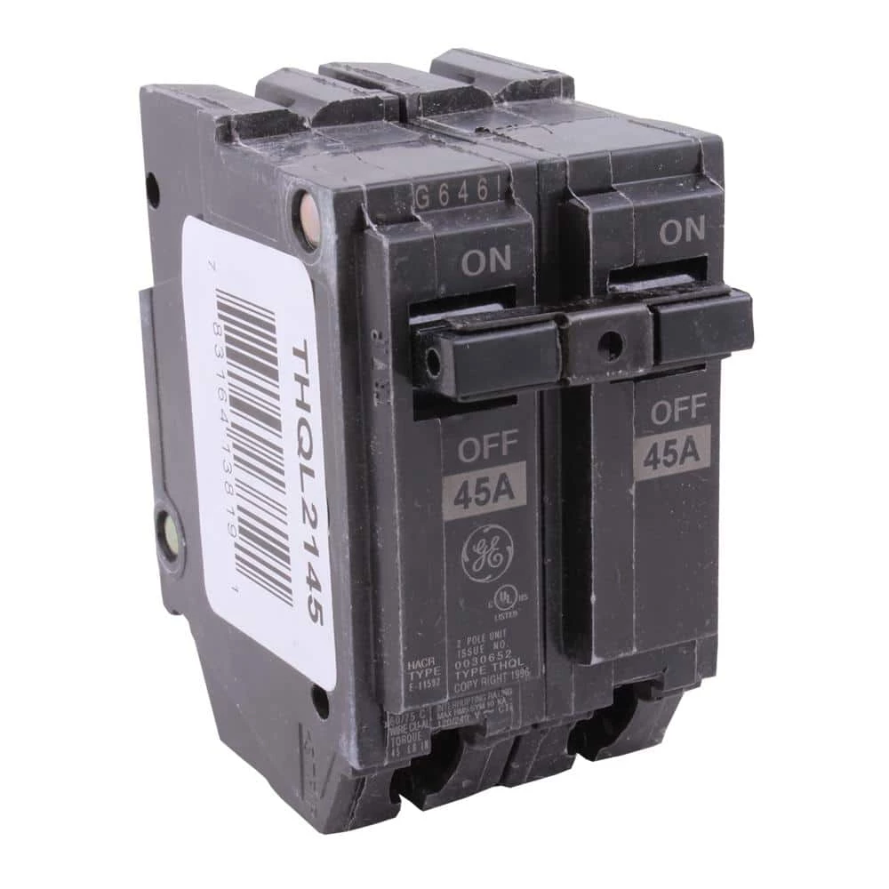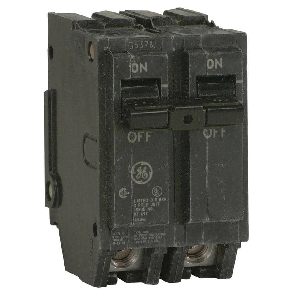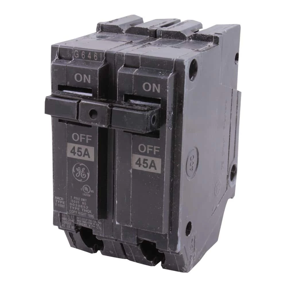The GE 45 Amp 2 in. Double-Pole Circuit Breaker is ANSI certified and CSA and UL listed. The breaker is federal government specification WC-375B qualified and features box-type terminals. This circuit breaker has a maximum rating of 45 Amp and offers 2 poles with a plug-in design for easy installation.