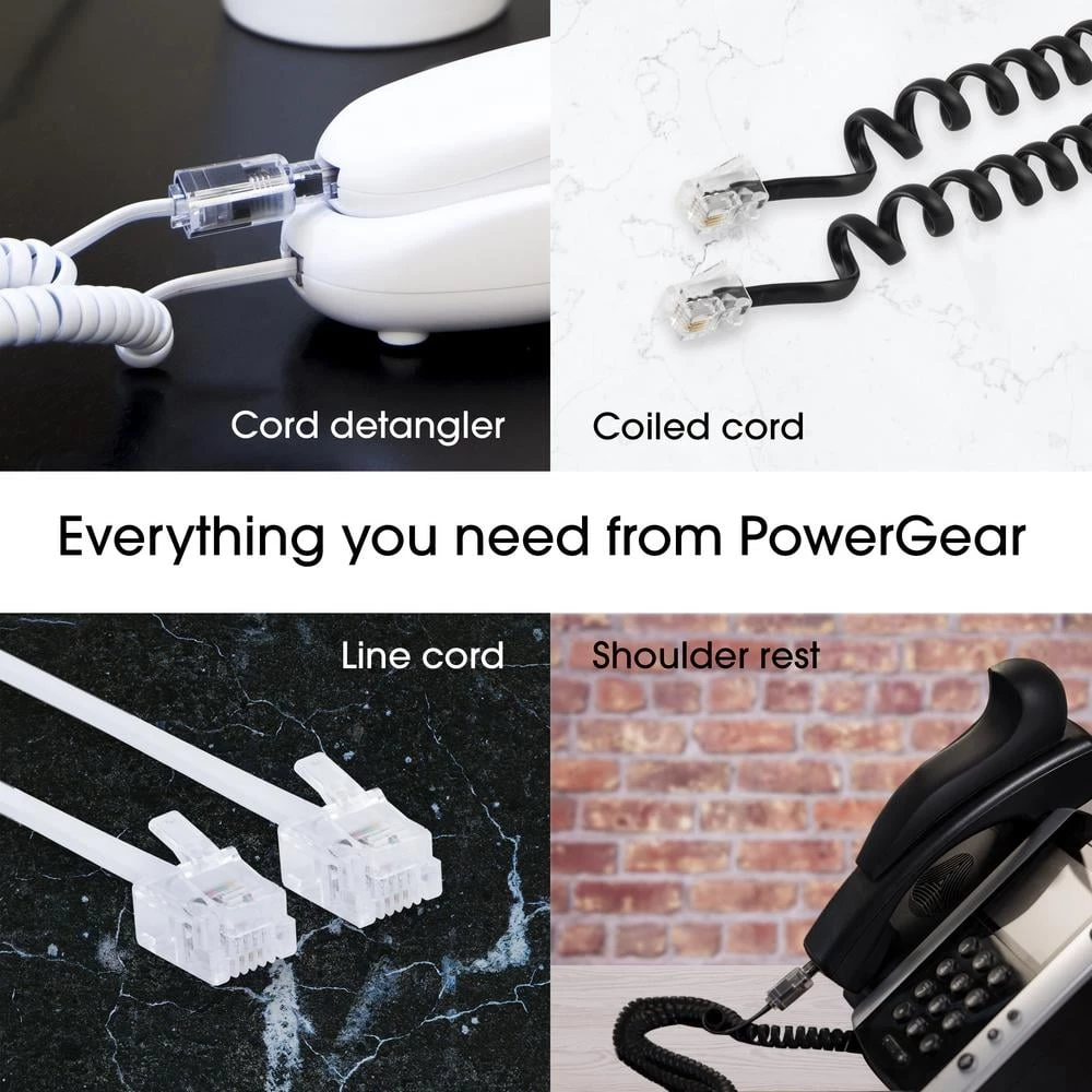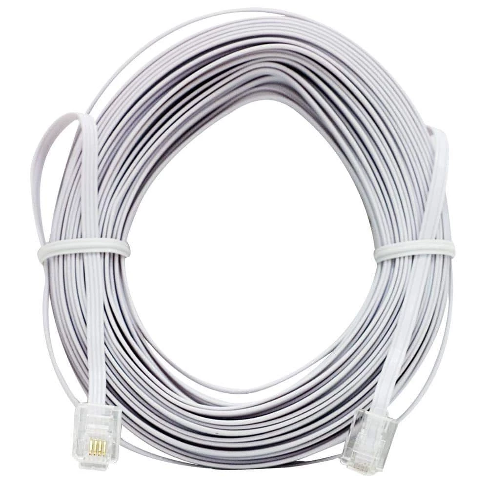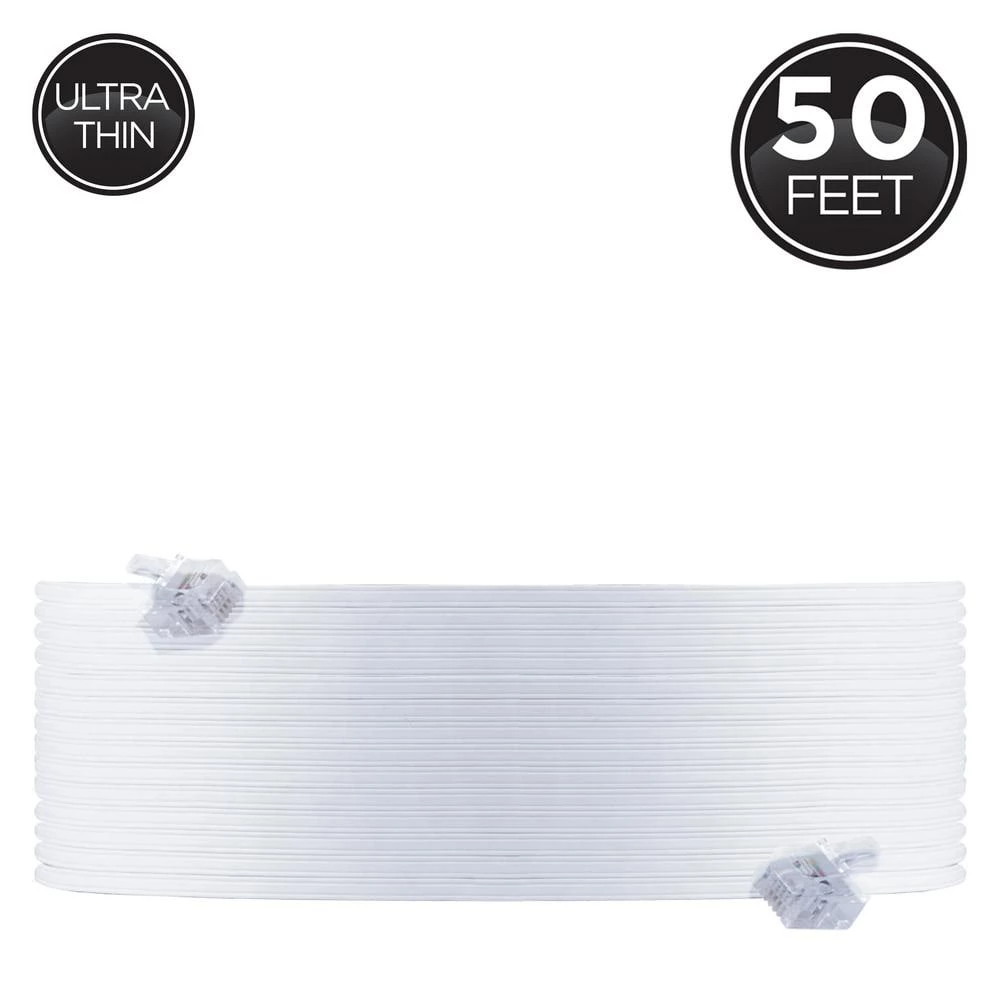 Make a good call by choosing the Power Gear Ultra-Thin 50 ft. Phone Line Cord and replace your old, worn-out or damaged cord with a high-quality upgrade. The cord’s extra-long 50 ft. length improves the reach of your landline phone and is perfect for swapping out shorter versions to give you plenty of freedom to place the phone almost anywhere in the room. This cord is equipped with a plug at each end to fit standard phone jacks, so you can immediately put it to use right out of the package. Compatible with all brands of landline phones, modems, fax machines and other equipment with standard phone jacks, installation is easy. Simply snap the cord’s connectors into place as you connect your device to an in-wall phone jack or other compatible device. The cord’s ultra-thin, durable yet flexible jacket protects against everyday wear and tear, allows for use in tight spaces and comes in a white finish, making it ideal for home or office use. Get answers with the Power Gear Ultra-Thin 50 ft. Phone Line Cord.