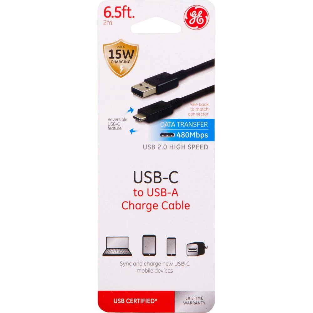 Experience the future of charging with the GE-branded USB-A to USB-C Charge Cable. Use this cord to sync your USB-A devices with the newest USB-C equipment, as well as charge your USB-C devices using USB-A chargers. With its universal and future-ready design, the USB-C is quickly becoming the industry standard for charging and powering laptops, tablets, smartphones and more. The USB-C connector is also reversible, with no up or down orientation, attaching easily on the first try. Simply plug the USB-A connector into your device and plug the USB-C end into your laptop or charger. The 6.5 ft. charging cable offers versatile setup options for your home or office space. Stay connected with the GE-branded USB-A to USB-C Charging Cable.