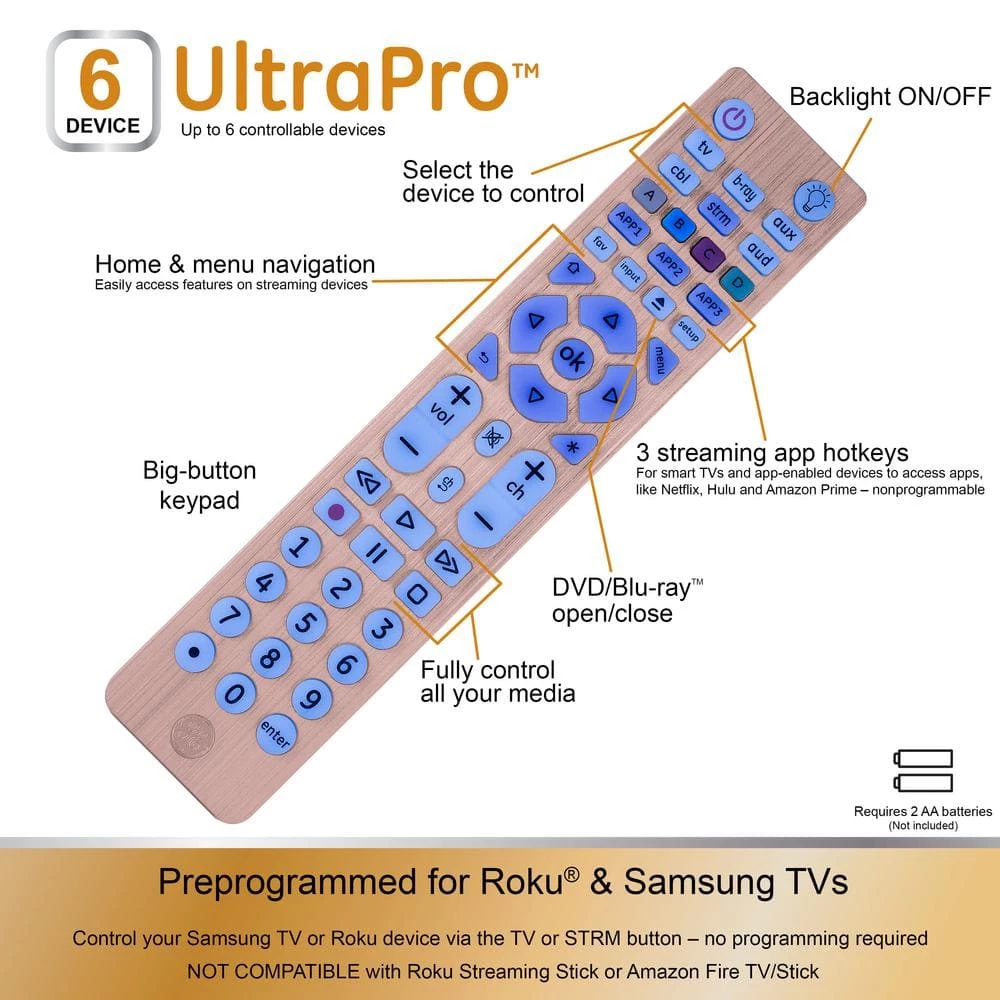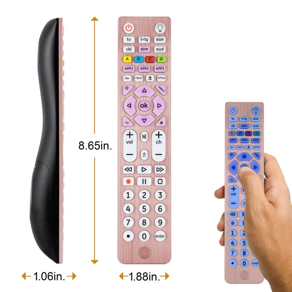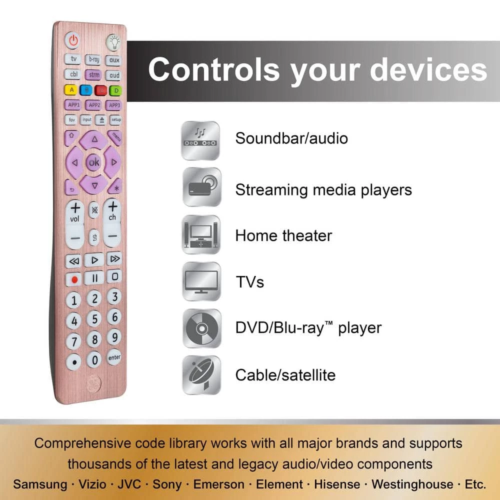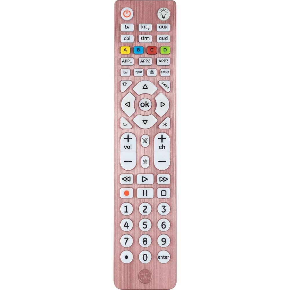 Consolidate control with the GE-branded 6-Device, Backlit Universal Remote in a beautiful, brushed rose gold finish. No need to worry about keeping track of multiple controllers – this remote can operate up to 6 devices, including your TV, Blu-ray/DVD player, streaming media player, cable, satellite, sound bar and more. Eliminate the hassle of managing multiple remotes as you take charge of your home entertainment system. Preprogrammed for immediate use with Samsung TVs and Roku boxes, this remote offers simple, user friendly setup with your choice of automatic code search or direct code entry. The master volume control feature allows you to adjust the audio regardless of which device is being used. Full backlighting with blue LEDs gives you enhanced visibility when operating your remote in low-light settings. for added convenience, this remote includes a Blu-ray/DVD player open/close button as well as advanced DVR functions, simple menu navigation and a dot button for sub-channel access. Organize your entertainment with this GE-branded 6-Device, Backlit Universal Remote.