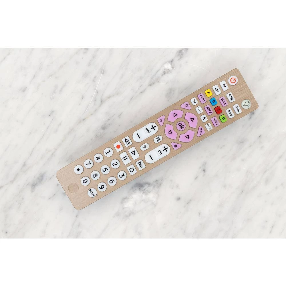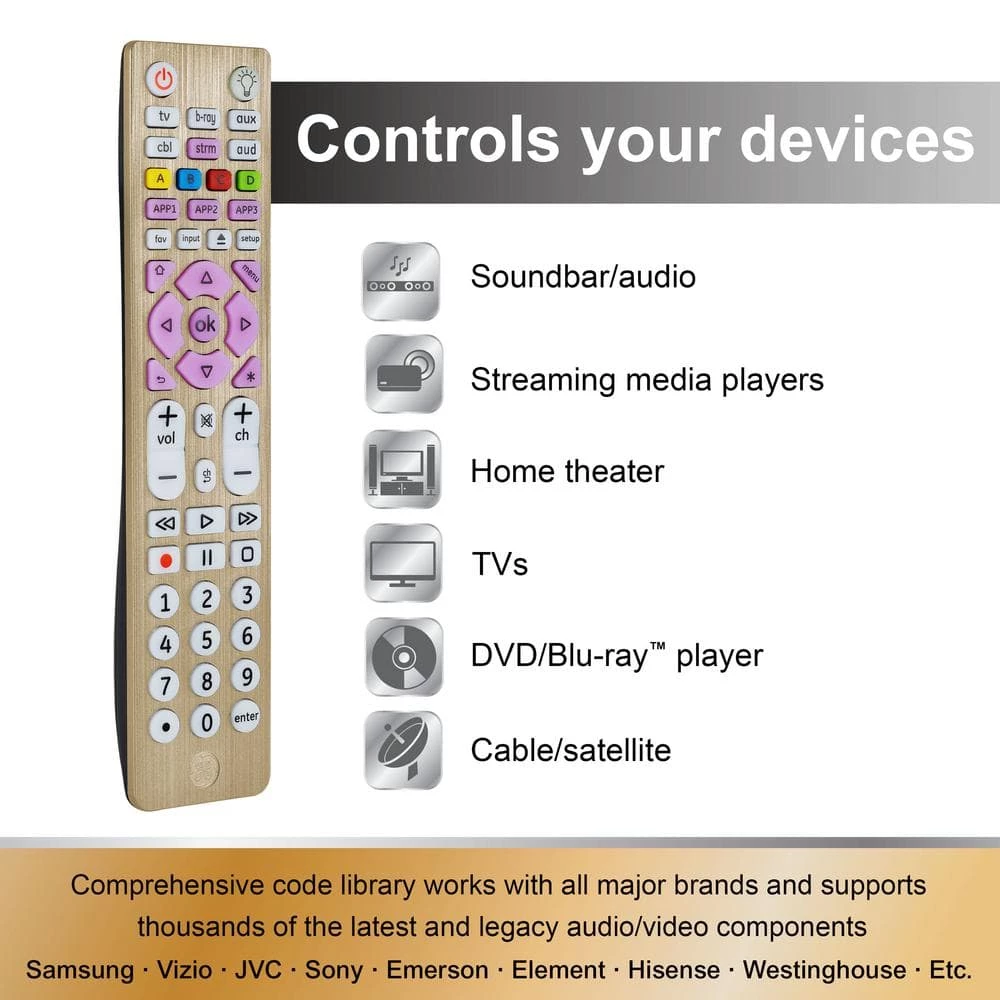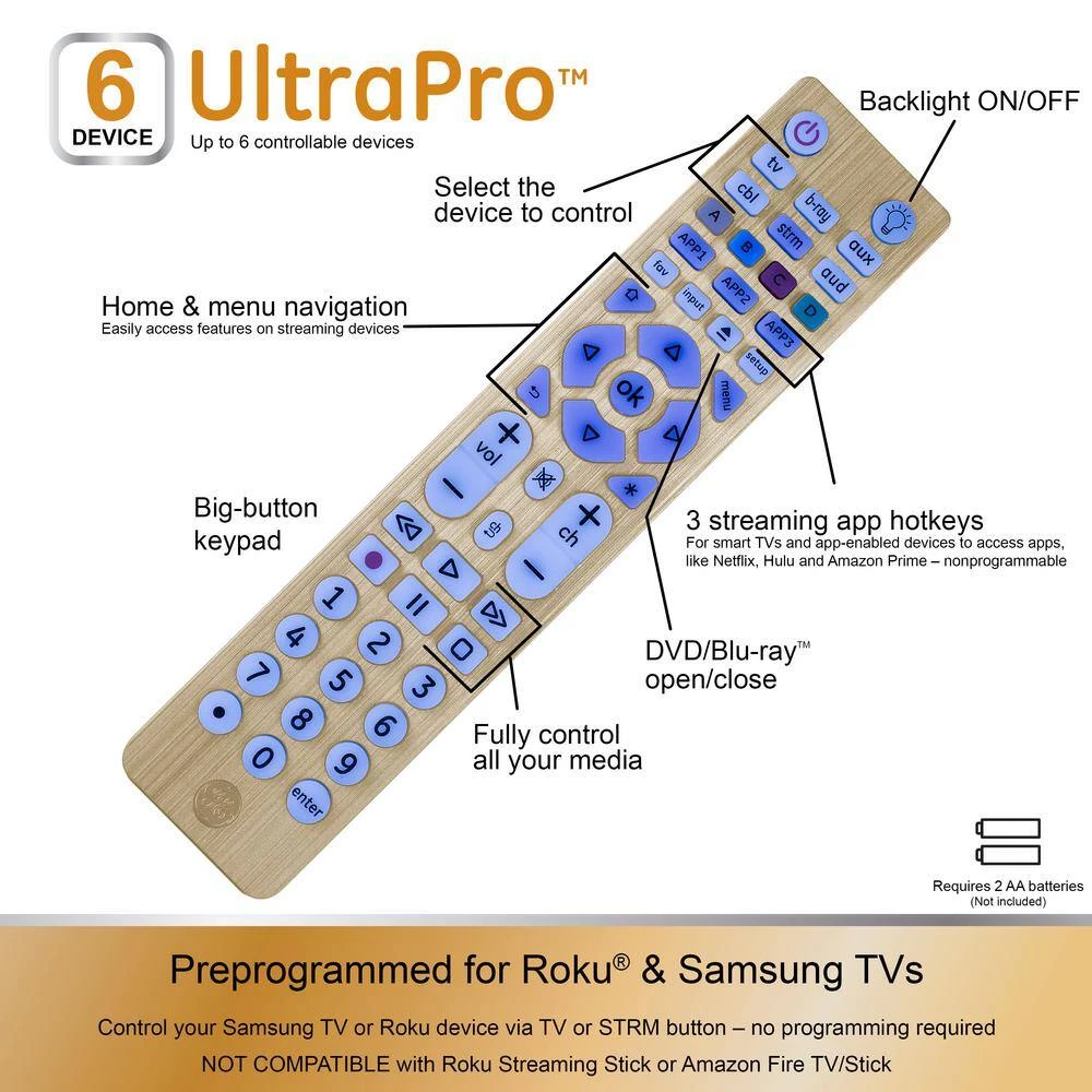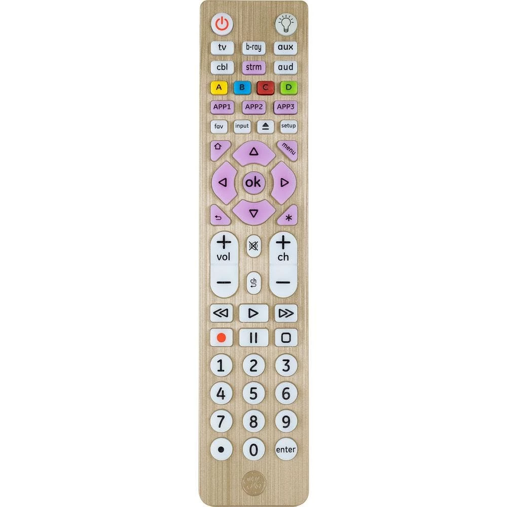 Consolidate control with the GE-branded 6-Device, Backlit Universal Remote in an elegant, brushed gold finish. No need to worry about keeping track of multiple controllers – this remote can operate up to 6 devices, including your TV, Blu-ray/DVD player, streaming media player, cable, satellite, sound bar and more. Eliminate the hassle of managing multiple remotes as you take charge of your home entertainment system. Preprogrammed for immediate use with Samsung TVs and Roku boxes, this remote offers simple, user friendly setup with your choice of automatic code search or direct code entry. The master volume control feature allows you to adjust the audio regardless of which device is being used. Full backlighting with blue LEDs gives you enhanced visibility when operating your remote in low-light settings. for added convenience, this remote includes a Blu-ray/DVD player open/close button as well as advanced DVR functions, simple menu navigation and a dot button for sub-channel access. Organize your entertainment with this GE-branded 6-Device, Backlit Universal Remote.
