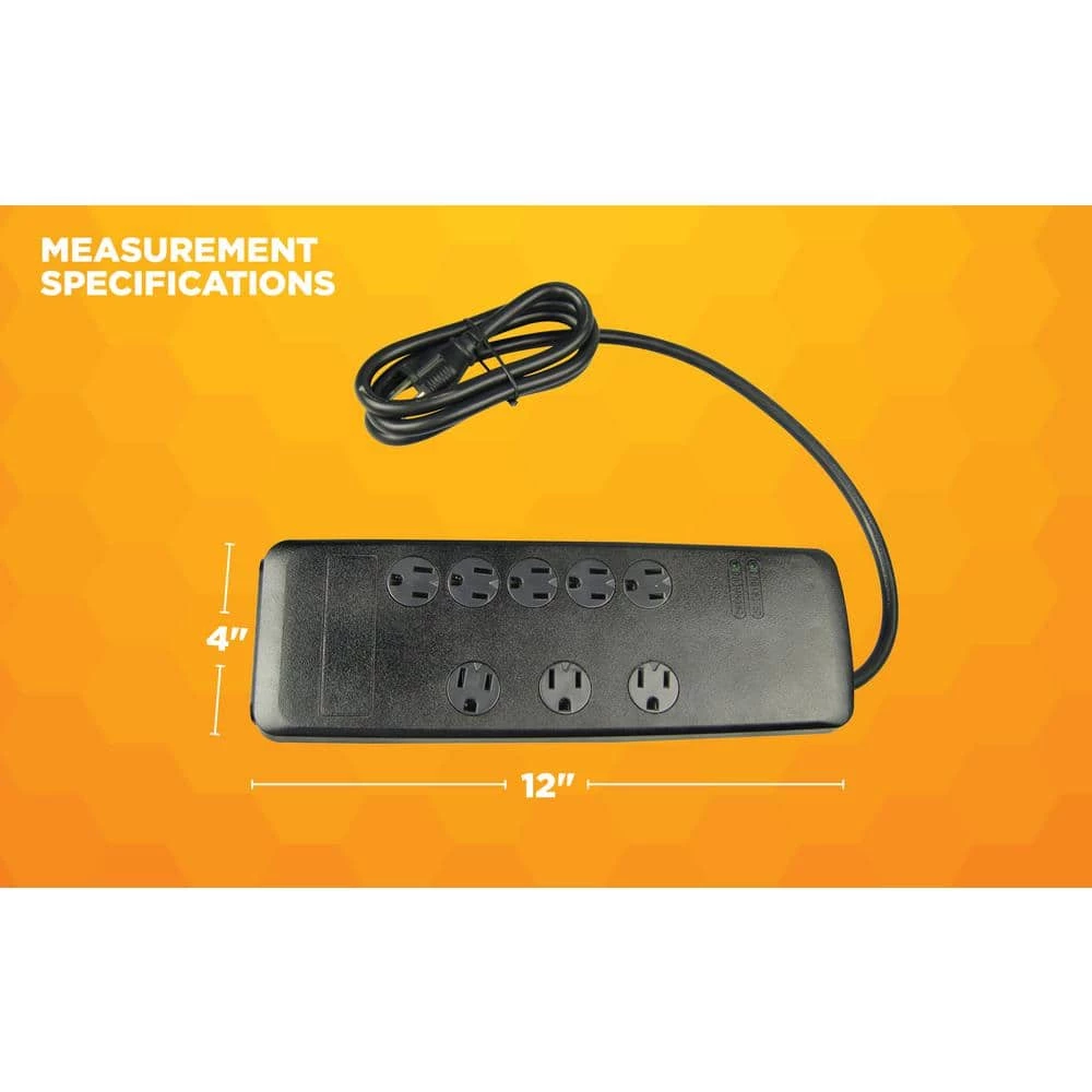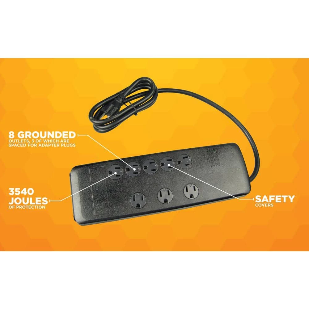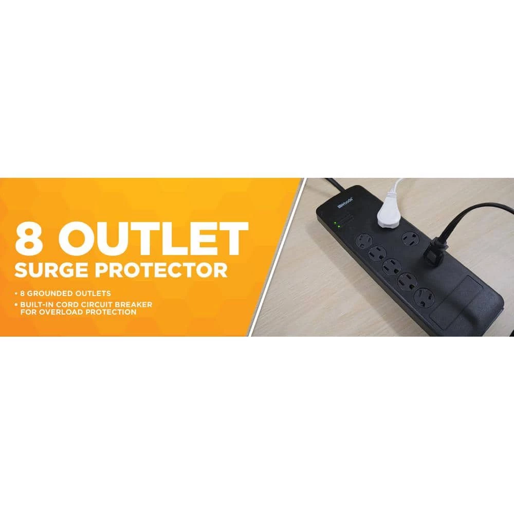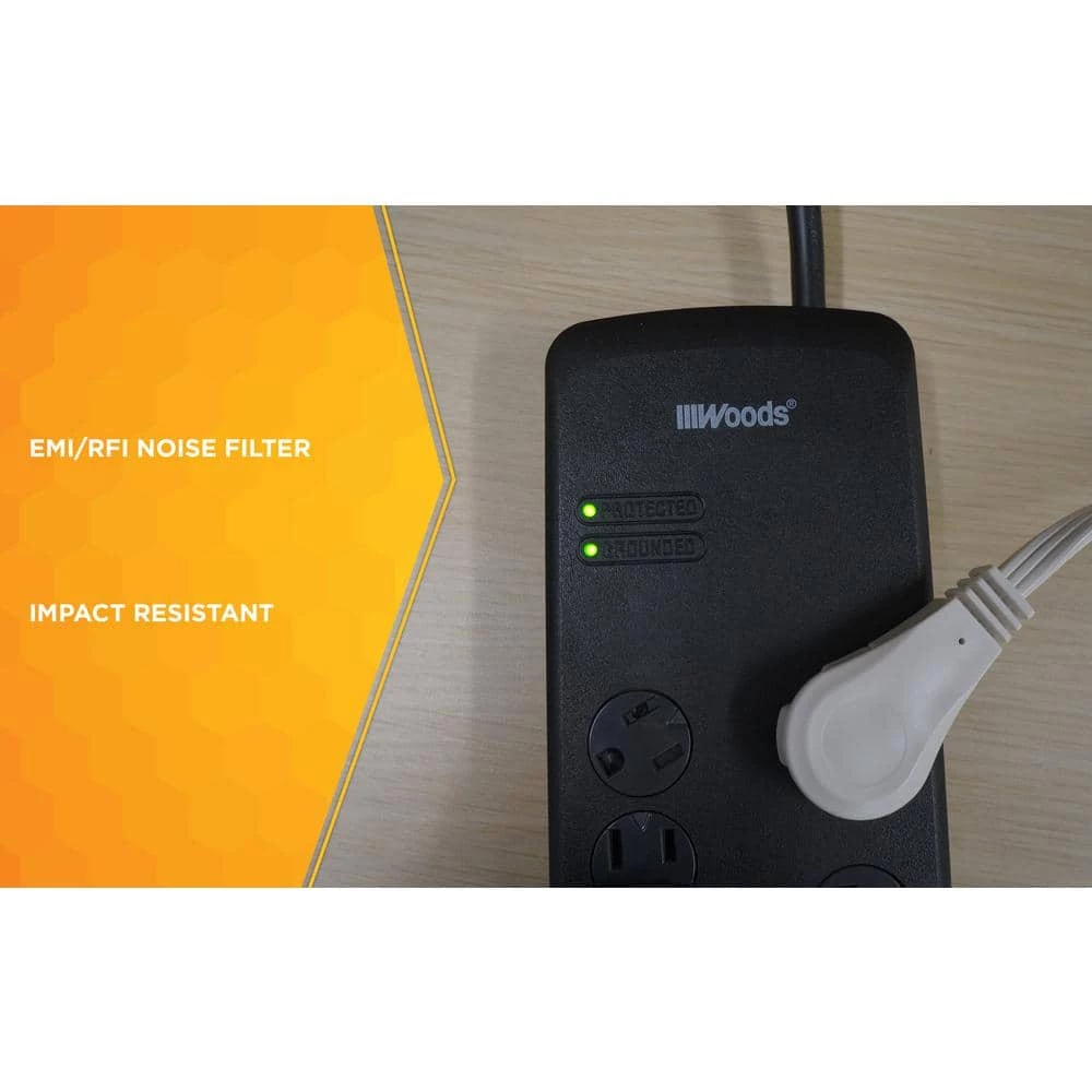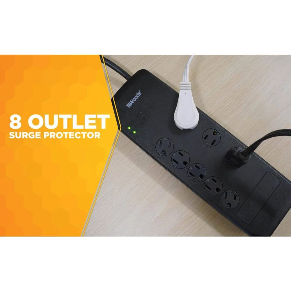 Woods 8 -Outlet Surge Protector features 3540-Joules, 6 ft. cord with flat plug, 3 adapter spaced -Outlets, safety covers and overload protection. With a slim, space-saving profile and a flat plug design, this heavy duty surge protector doesnt take up much space; with safety covers to protect the sockets. Instantly expanding a single power -Outlet into 8 -Outlets, the wall -Outlet surge protector also protects your electrical devices from damage in the event of a voltage spike.