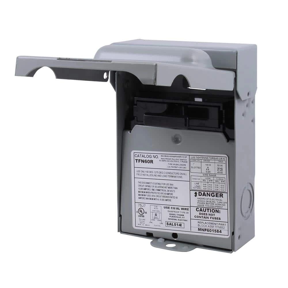 The 60 Amp 240-Volt Non-Fuse Metallic AC Disconnect is designed to stop the power going to an air conditioning unit to allow for safe working conditions. The disconnect is a non-fuse, puller type and is UL listed with an enclosed pull-out switch.