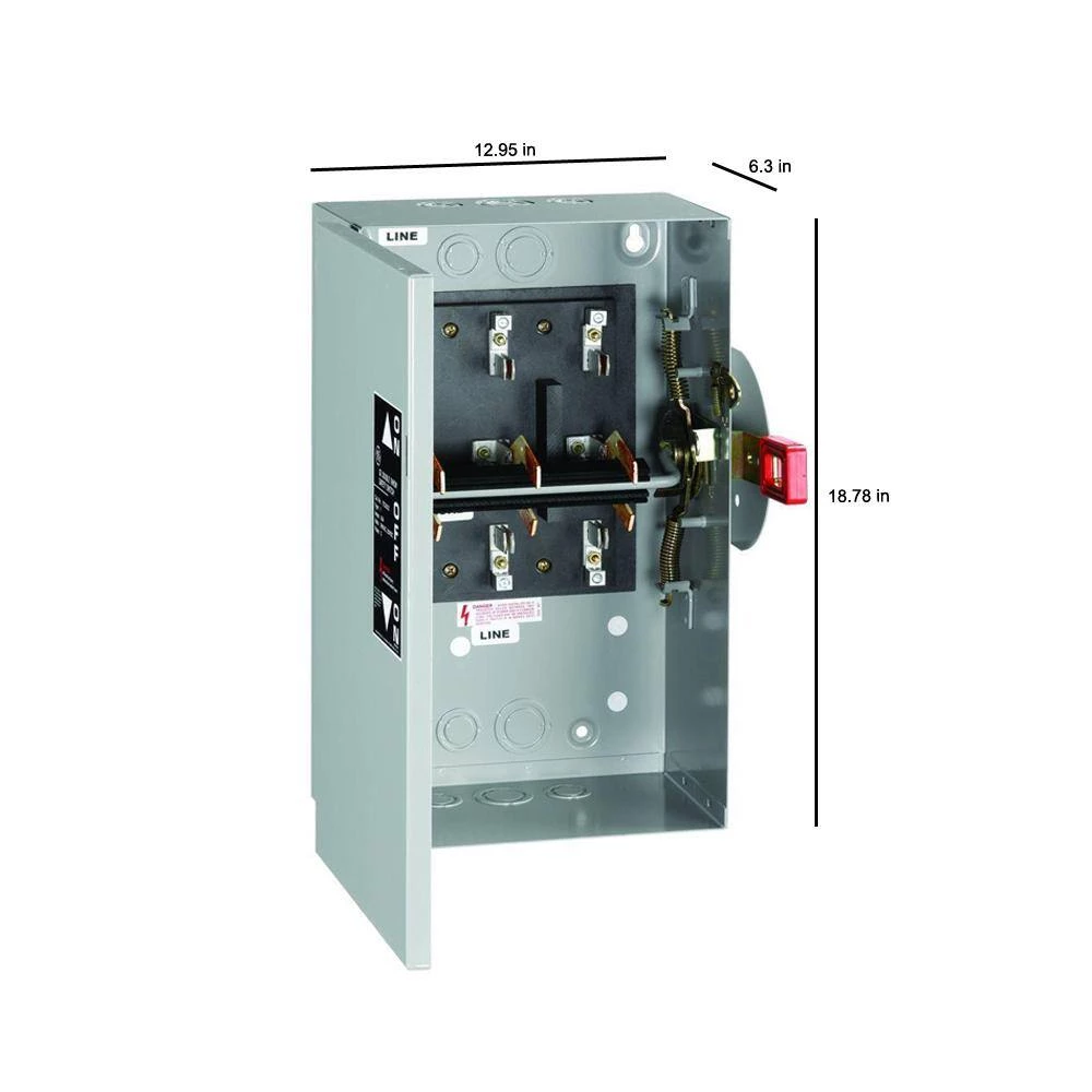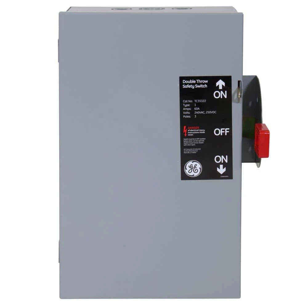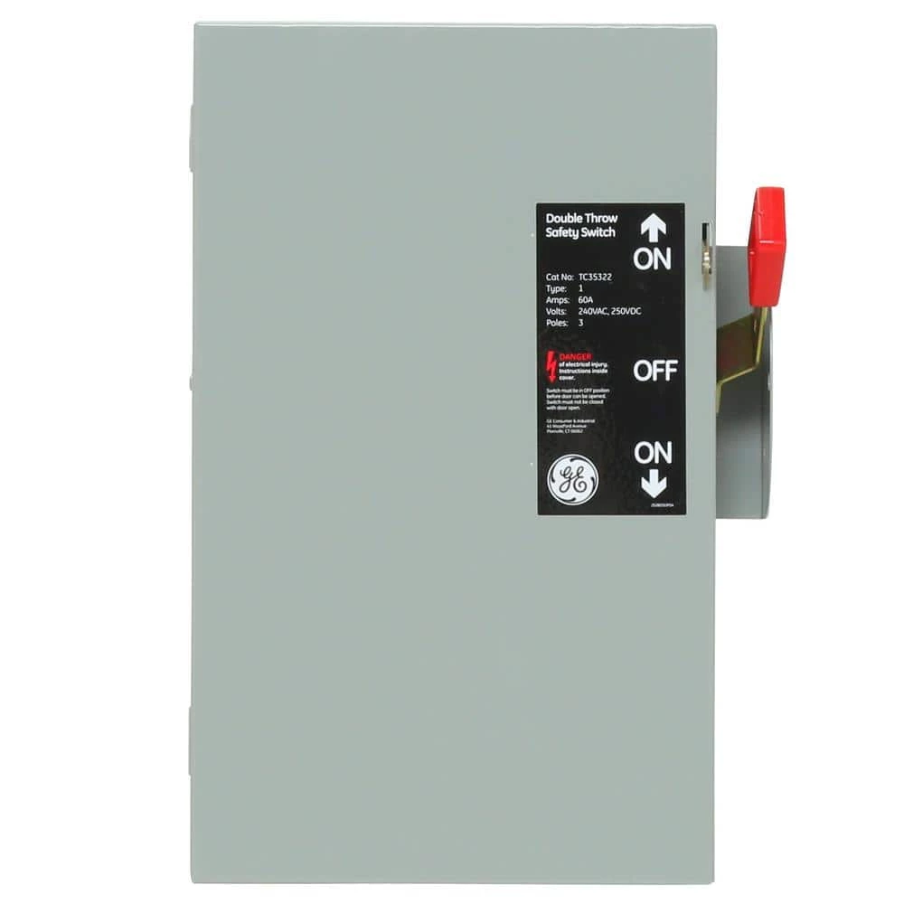 Ideal for hook-stick operation, this GE 60 Amp 240-Volt Non-Fused Indoor General-Duty Double-Throw Safety Switch features a rugged, easy-to-grip molded thermoplastic donut handle with a bright red finish for high visibility. This safety switch offers a lockable 3-position (on-off-on) handle for added security.