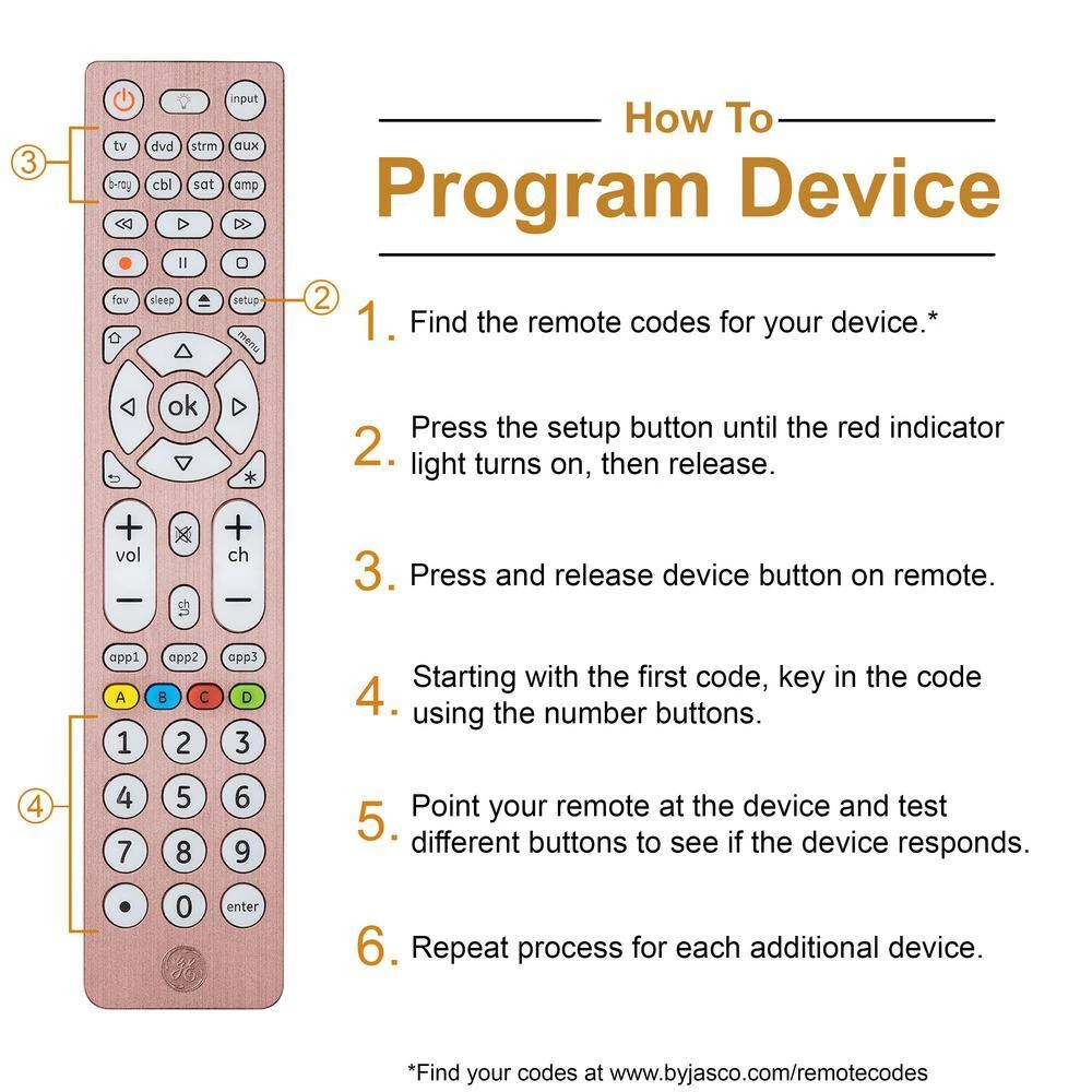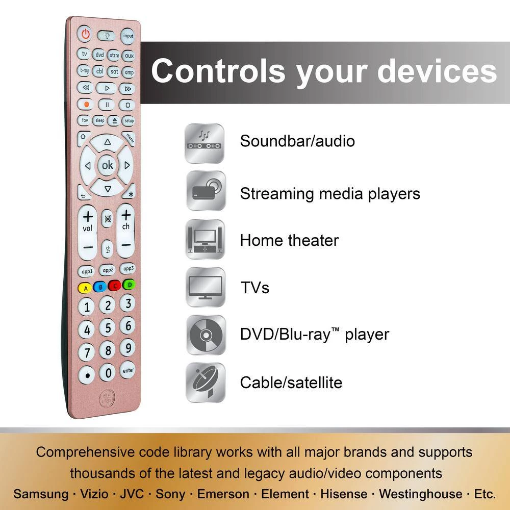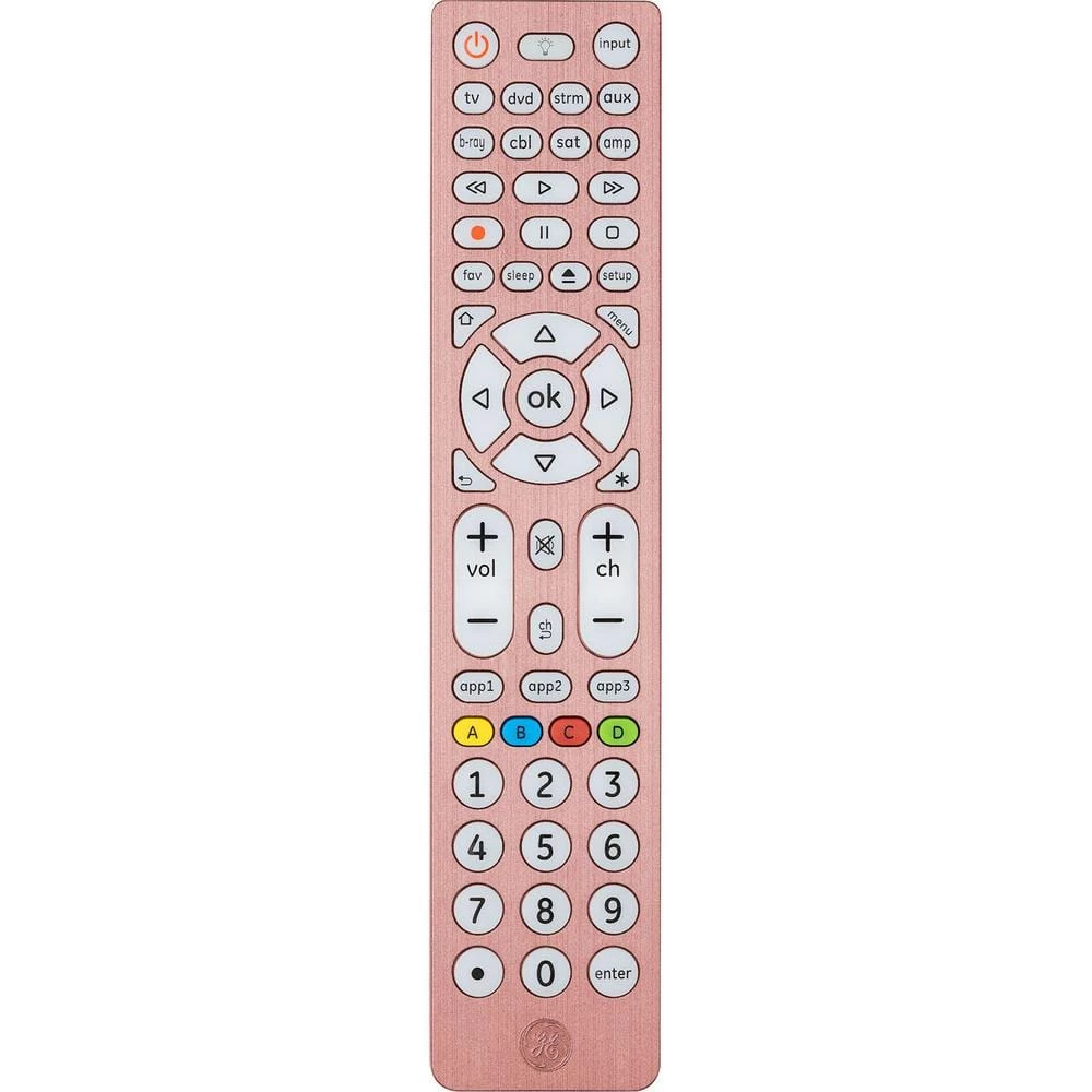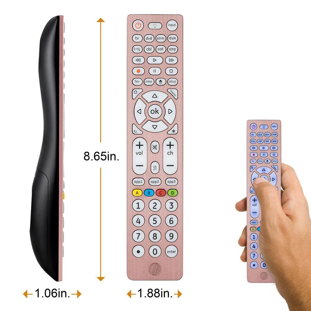 Consolidate control with the GE-branded 8-Device, Backlit Universal Remote in a beautiful, brushed rose gold finish. No need to worry about keeping track of multiple controllers – this remote can operate up to 8-devices, including your TV, Blu-ray/DVD player, streaming media player, cable, satellite, sound bar and more. Eliminate the hassle of managing multiple remotes as you take charge of your home entertainment system. Preprogrammed for immediate use with Samsung TVs and Roku boxes, this remote offers simple, user friendly setup with your choice of automatic code search or direct code entry. The master volume control feature allows you to adjust the audio regardless of which device is being used. Full backlighting with blue LEDs gives you enhanced visibility when operating your remote in low-light settings. for added convenience, this remote includes a Blu-ray/DVD player open/close button as well as advanced DVR functions, simple menu navigation and a dot button for sub-channel access. Organize your entertainment with this GE-branded 8-Device, Backlit Universal Remote.