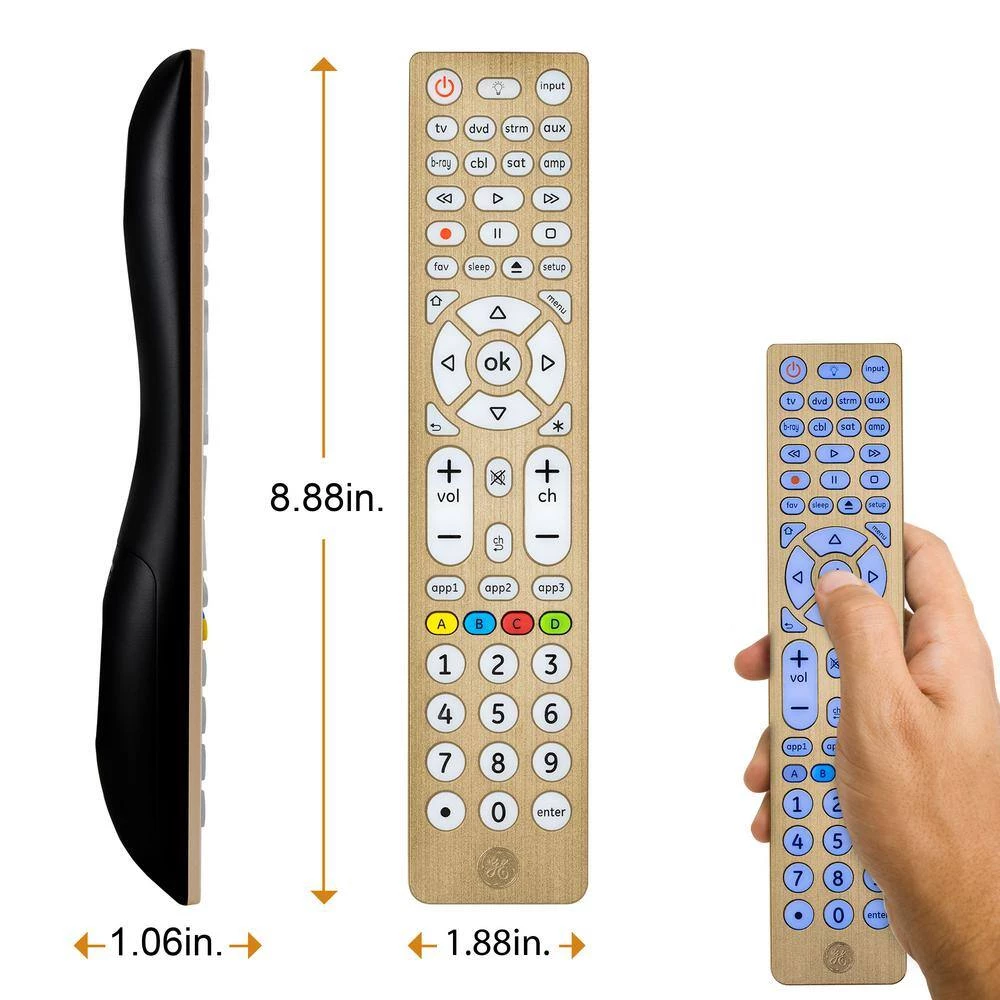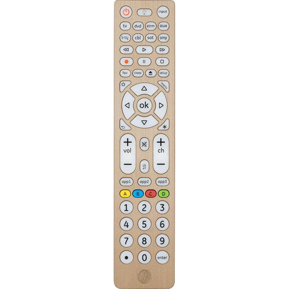 Consolidate control with the GE-branded 8-Device, Backlit Universal Remote in an elegant, brushed gold finish. No need to worry about keeping track of multiple controllers – this remote can operate up to eight devices, including your TV, Blu-ray/DVD player, streaming media player, cable, satellite, sound bar and more. Eliminate the hassle of managing multiple remotes as you take charge of your home entertainment system. Preprogrammed for immediate use with Samsung TVs and Roku boxes, this remote offers simple, user friendly setup with your choice of automatic code search or direct code entry. The master volume control feature allows you to adjust the audio regardless of which device is being used. Full backlighting with blue LEDs gives you enhanced visibility when operating your remote in low-light settings. for added convenience, this remote includes a Blu-ray/DVD player open/close button as well as advanced DVR functions, simple menu navigation and a dot button for sub-channel access. Organize your entertainment with this GE-branded 8-Device, Backlit Universal Remote.