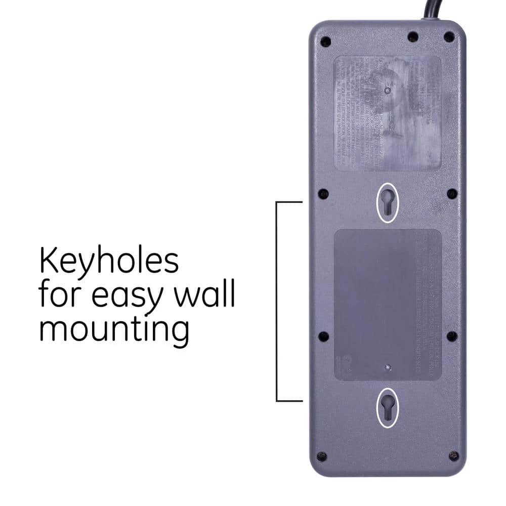 - Functionality: Included keyhole slots make this unit easy to mount to a desk, table or counter. A built-in power filter reduces interference to provide a cleaner sound and picture experience. Power indicator light shows that your surge protector is functioning properly.