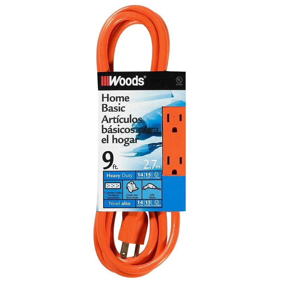 9 ft. 3-Outlet Extension Cord with Power Tap, Orange. Provides total of 3 outlets. Industry approvals: ul listed. Solid molded power taps in a compact design. Strain relief neck for a longer power cord life. Use indoors for tools, appliances, lamps, and more. The Woods (R) brand is a registered trademark of Coleman Cable Inc. Southwire Company, LLC is North America’s leading manufacturer of wire and cable used in the distribution and transmission of electricity. Throughout its history, our company has sought to help provide power through our products, our service and by helping empower our customers, employees and communities.