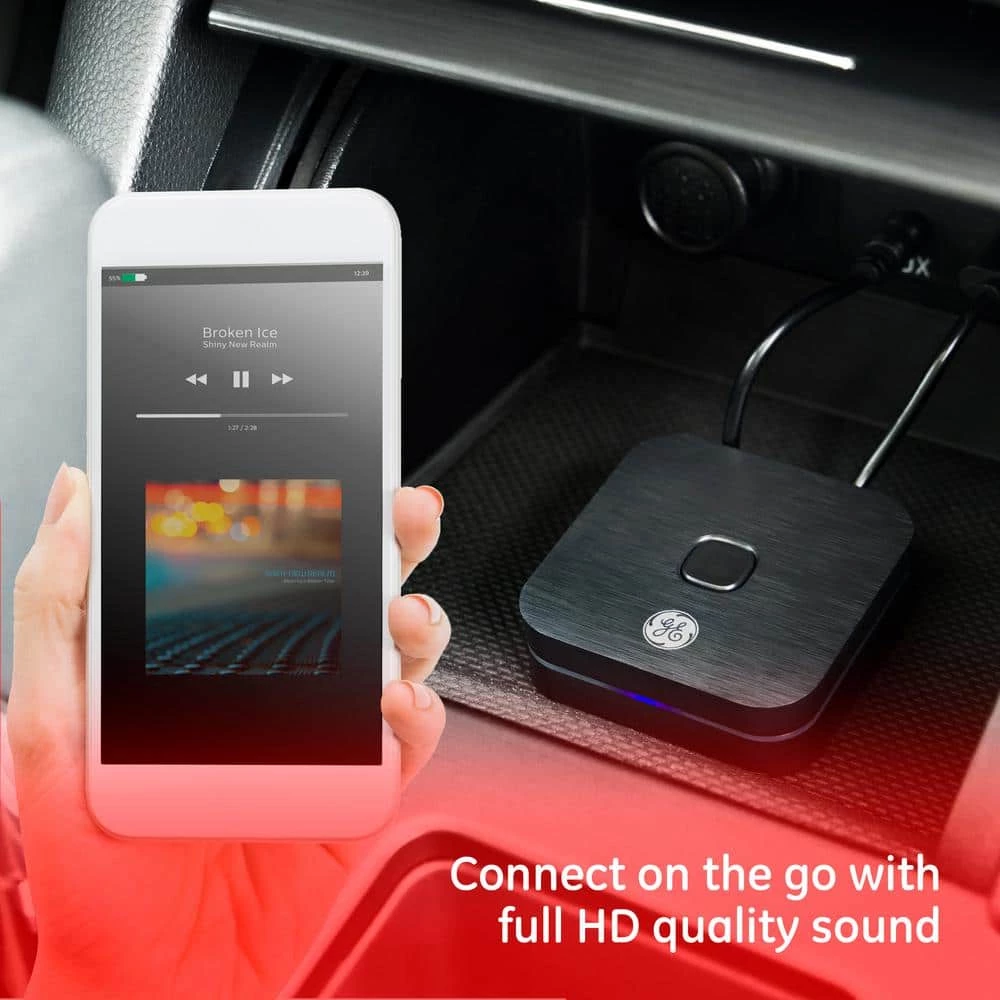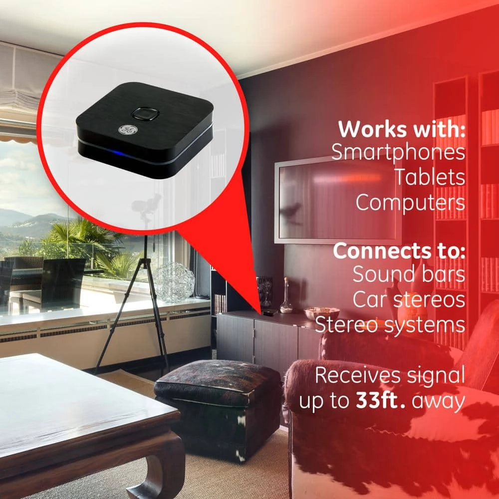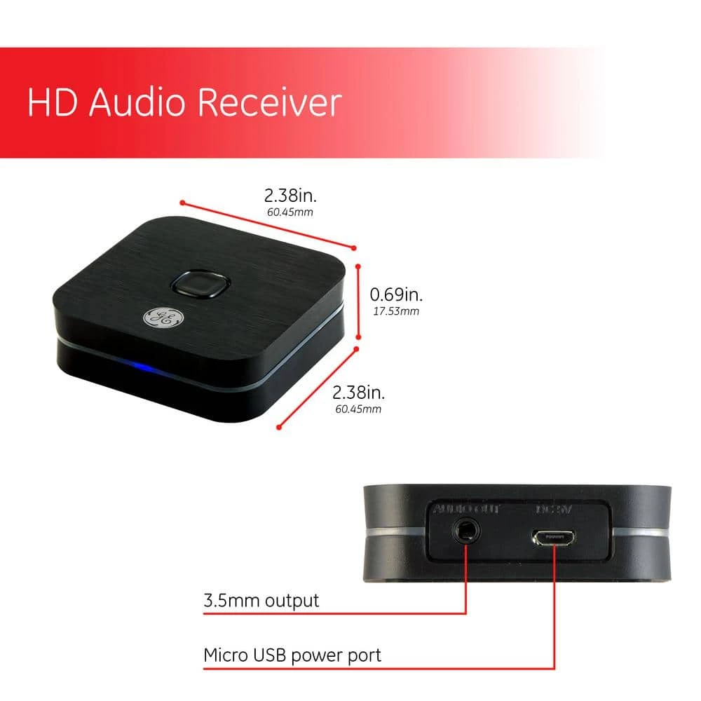 Unplug and listen with the GE Bluetooth Home Audio Receiver. This receiver instantly makes your speaker system and other favorite audio devices Bluetooth compatible. It’s the perfect solution to stay connected to your playlists without the limited range of audio cables. You don’t have to stop with speakers. Any equipment with a 3.5 mm jack or RCA audio ports, like car stereos and sound bars, is easily converted to a Bluetooth device. A micro USB charging cord, 3.5 mm audio cable and 3.5 mm-to-RCA adapter are included to power your receiver and stay connected to your music. The compact receiver has a range of up to 30 ft. from the source, giving you the freedom to roam, and can be paired with up to eight smartphones, tablets, laptops or other Bluetooth-equipped devices. A call break-in feature interrupts playback when you receive a phone call to keep your conversations private. Increase your music’s range with the GE Bluetooth Home Audio Receiver.