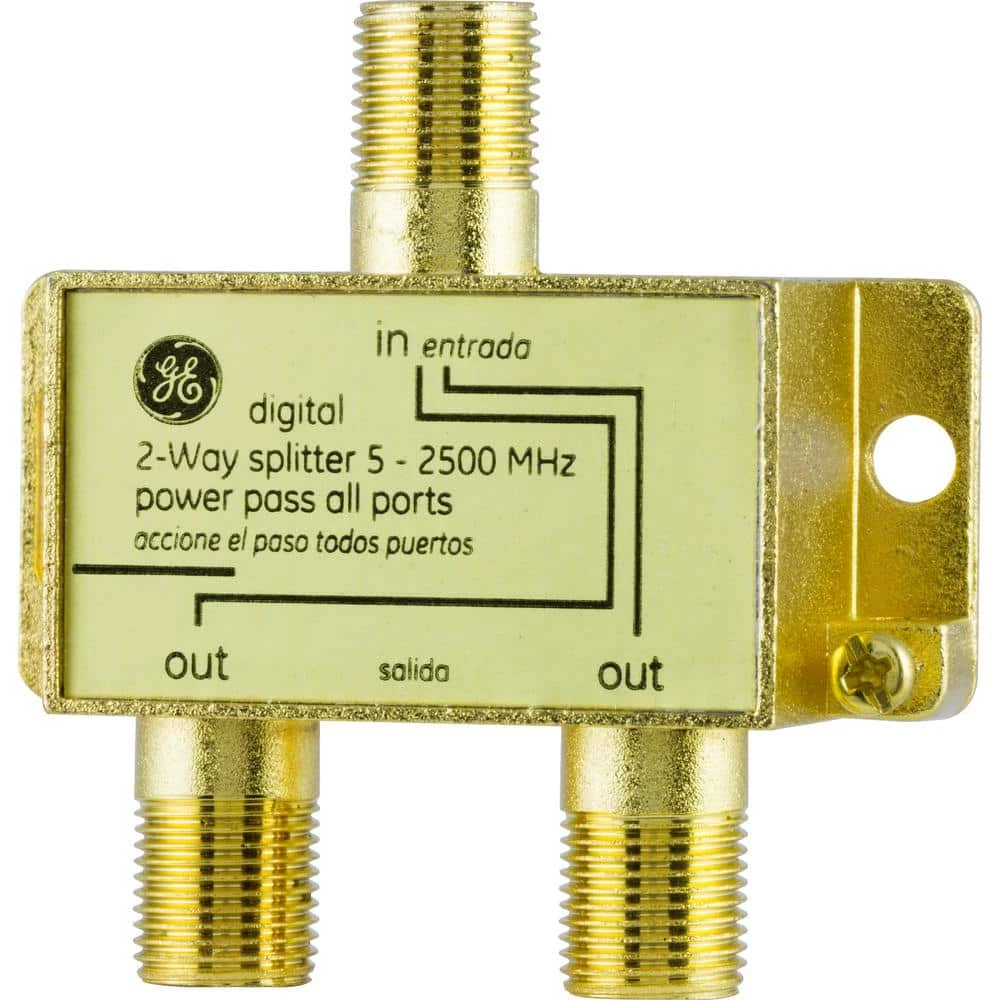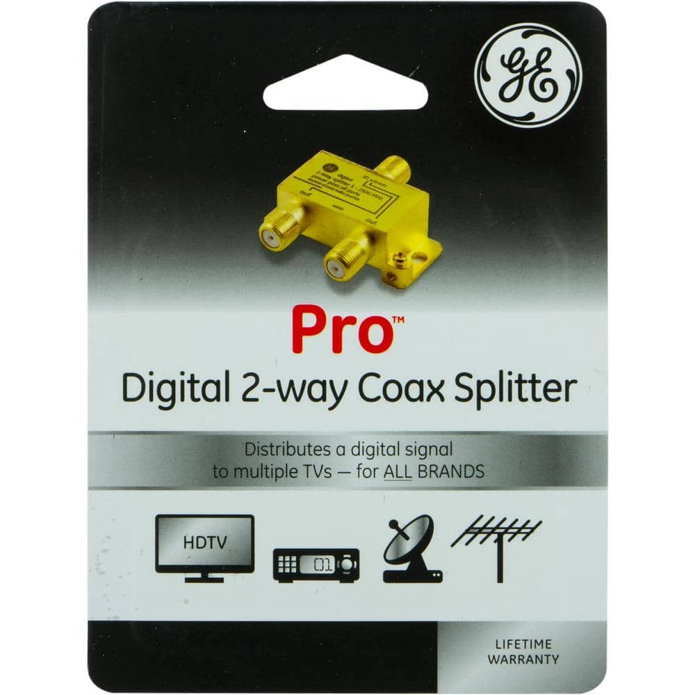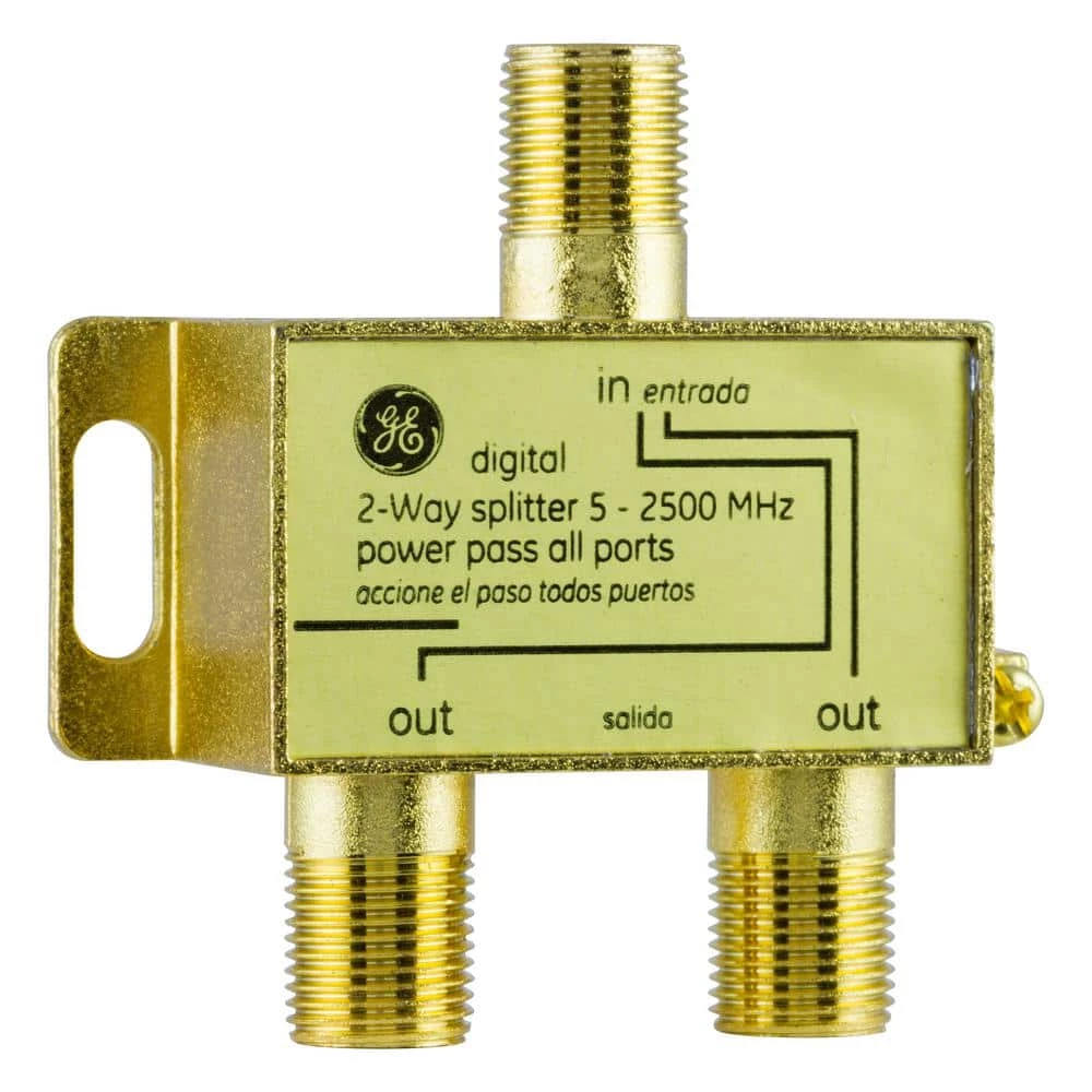 The GE 2-Way Coaxial Cable Splitter splits a single incoming cable or satellite signal coming from your cable or satellite receiver, VCR, or antenna into multiple outgoing signals. The nickel plating ensures a corrosion-free connection. The GE 2-Way Coax Cable Splitter is backed by a lifetime warranty.