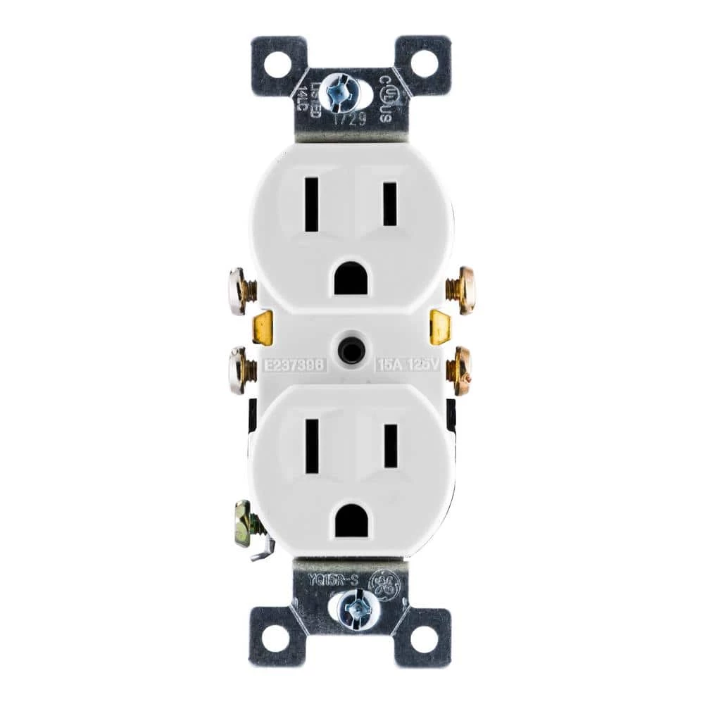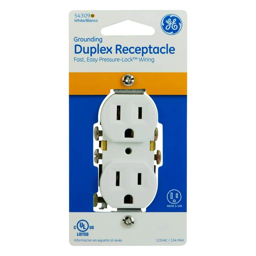The GE Grounding Duplex Receptacle features fast, easy Pressure-Lockwiring. Perfect for new installation or replacement outlets. The Pressure-Lockterminals are for use on 15-Amp branch circuits with No. 14 AWG solid copper conductors only. Screw terminals are for use with No. 12 or 14 AWG copper wire. Complete installation instructions inside. Remove fuse or turn circuit breaker to OFF before wiring. This product is UL listed and backed by a 90-day limited warranty.