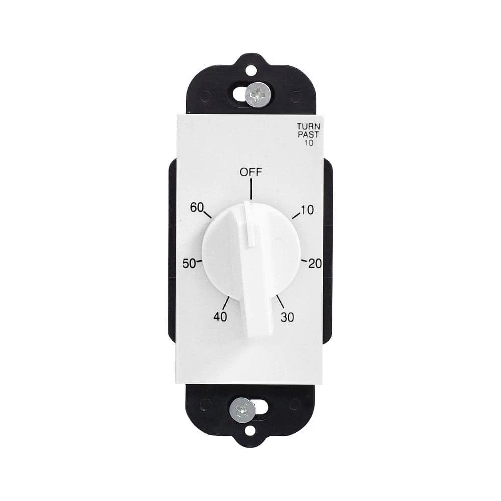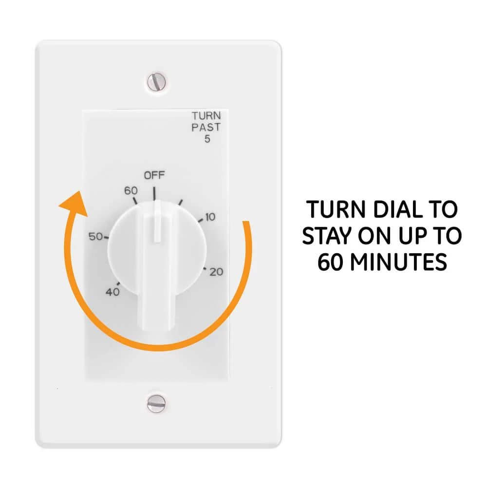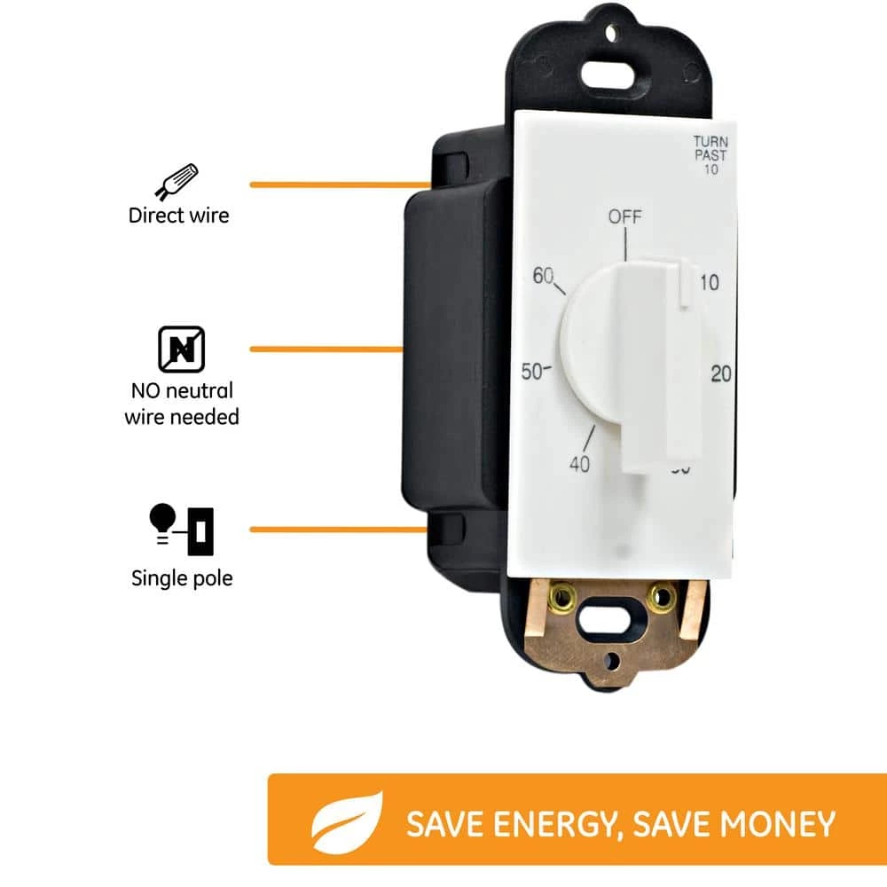 The GE In-Wall Spring Wound Countdown Timer controls a light or electrical device to stay on for up to 1 hour. This timer features an easy-to-use dial control that winds in increments of 10 minutes. Safely install this timer without a neutral wire. This timer is rated for 20 Amp, 125-Volt devices and is compatible with CFL lighting.
