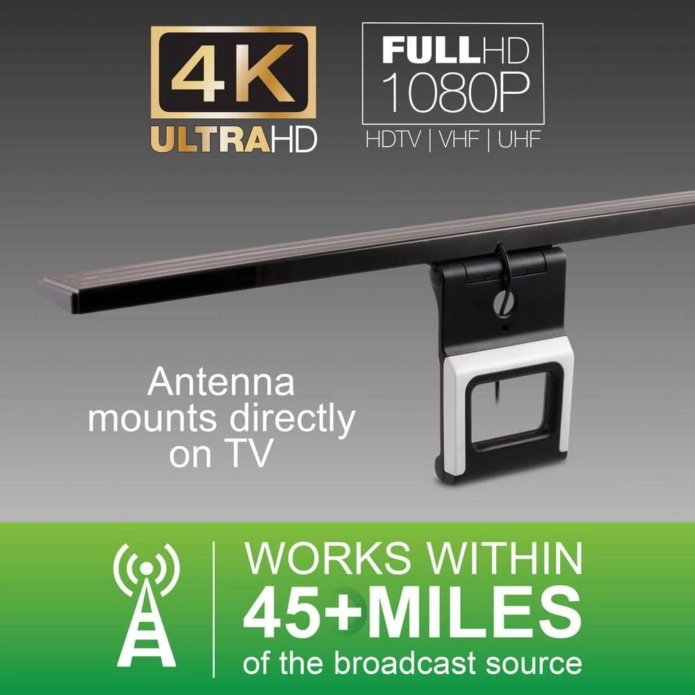 - Innovative design – this long, sleek bar antenna blends with your setup, provides enhanced VHF signal reception to receive the highest number of over-the-air channels within 45 plus miles and mounts securely to the top of your TV, perfectly placing the lighting feature for optimal backlighting benefits