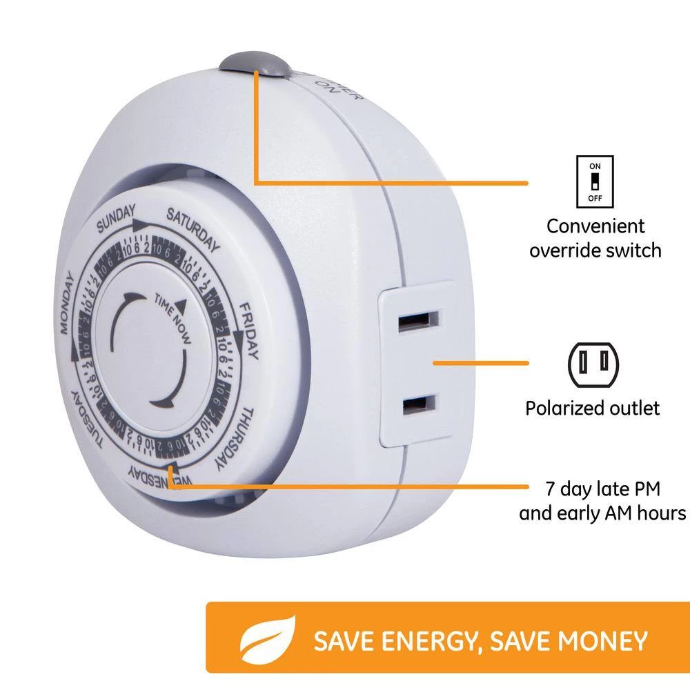 Help keep your energy costs low and feel secure with the GE 7-Day Mechanical Vacation Timer. Effective with any electrical device, the timer is preprogrammed to turn a lamp on and off during late evening and morning hours. The GE timer also has a random security feature, perfect for controlling lamps, seasonal lighting, or deterring crime when you are away. Works with CFL, LED and incandescent lighting. For indoor use only.