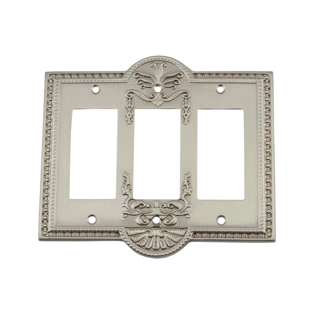 Embracing Greek revival, our Meadows switch plates are appealing to a wide variety of home dcor styles. The graceful, curved edges and decorative border make a bold statement. With our Satin Nickel finish, you can showcase a more neutral look that coordinates well with any traditional, vintage or contemporary home. Available in a variety of configuration options including: 1 Toggle, 2 Toggle, 3 Toggle, 1 Duplex (Socket), Double Duplex (Socket), 1 Toggle / 1 Duplex (Scoket), 1 Duplex (Socket) / 1 Rocker, 1 Rocker, 2 Rocker, 3 Rocker, 1 Toggle / 1 Rocker and Blank.