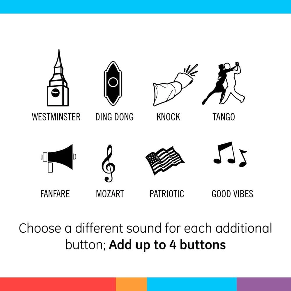 - Features 8 unique sounds – ding dong, fanfare, good vibes, knocks, Mozart, patriotic, tango and west-minister