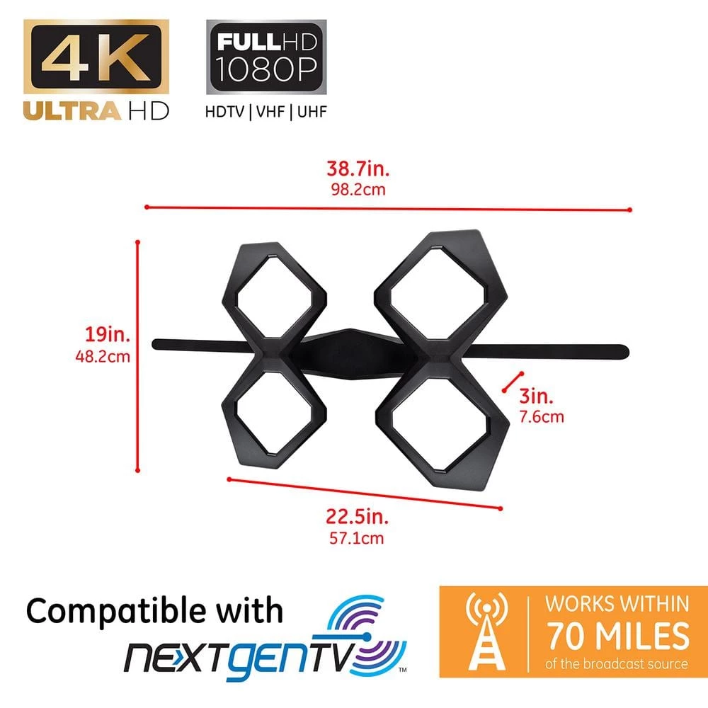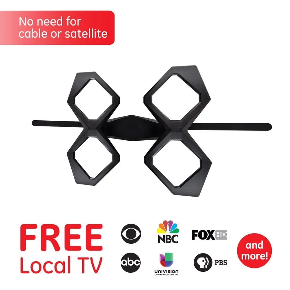 Prepare for the future of free TV with the GE Quadcore Outdoor HD Antenna. Ditch expensive cable and continue viewing your favorite local shows in full 1080p high definition at no cost. Enhanced reception and optimized local channels make this 4K Ultra HD-ready antenna the ideal counterpart to streaming your favorite digital content. This weatherproof antenna’s 4-diamond design ties directly into its core dipoles to capture a wide range of HDTV, VHF and UHF channels 70 plus miles from the broadcast source. It’s easy to assemble and can be mounted outdoors or in an attic using the included J-mount and hardware. Compatible with NextGen TV (ATSC 3.0), this antenna will make sure you’re ready to experience this new broadcast standard that delivers superior picture and sound, a stronger broadcast signal, faster refresh rates and more. And, if you’re not a cord-cutter, this HD antenna is a reliable counterpart to your cable or satellite subscription. When severe weather disrupts service, stay informed with a backup antenna for access to important local broadcasts. Enhance your HD viewing experience with the GE Quadcore Outdoor HD Antenna.