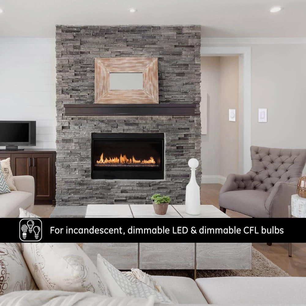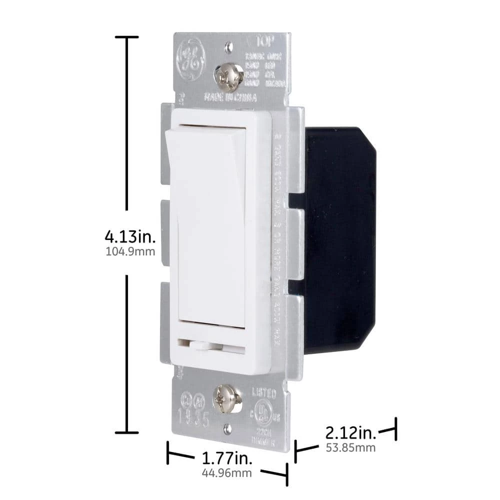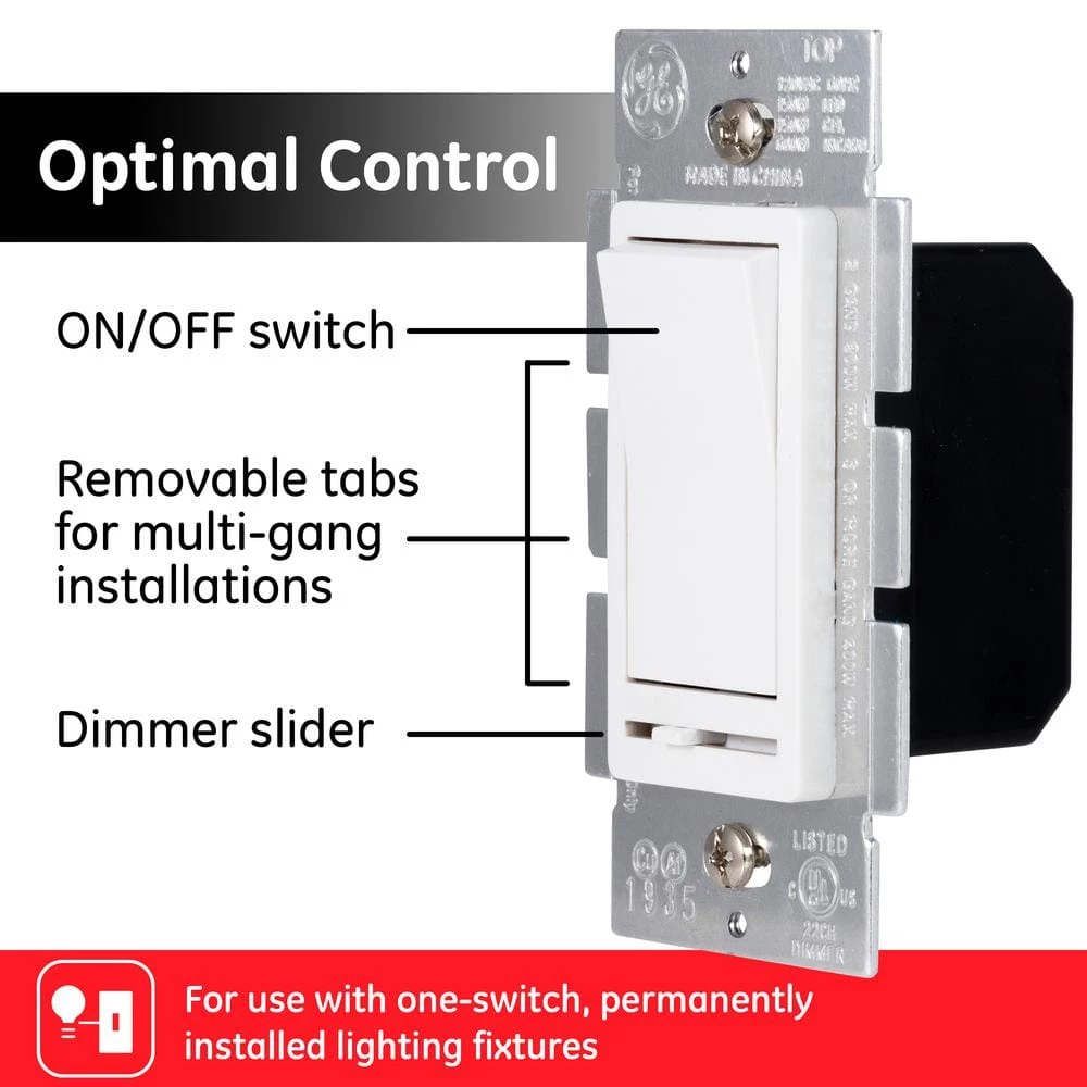 Save energy and money with the GE-branded Single Pole Slide Dimmer Rocker Switch. Ideal for replacing a standard switch, this rocker switch with sliding dimmer provides smooth dimming performance through single pole installations. Adjusting light levels with the dimmer’s full range of light controls can significantly reduce your home’s energy costs! The dimmer allows you to adjust the lighting in any room to fit any situation – turn the lights up when you have company or dim them for a movie. The rocker switch and slider come with in a bright white finish to complement existing decor, no matter your style. Compatible with single rocker traditional style wallplates, this switch features a sturdy housing with removable tabs for multigang installations. This dimmer works with incandescent, dimmable LED and dimmable CFL bulbs. Use indoors only with one-switch, permanently installed incandescent lighting fixtures – wallplate not included. This product is UL listed and backed by a one-year no-hassle replacement policy. Update your current lighting with a GE-branded Single Pole Slide Dimmer Rocker Switch.