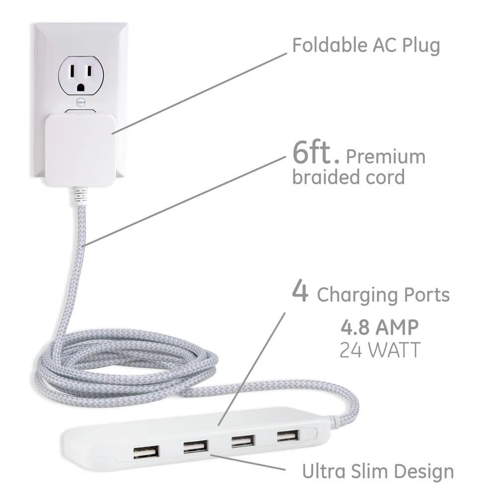- Power all your portable devices in one place with the 4 USB-A ports and the 6 ft. extra-long braided power cable for optimal reach to free up space near outlets