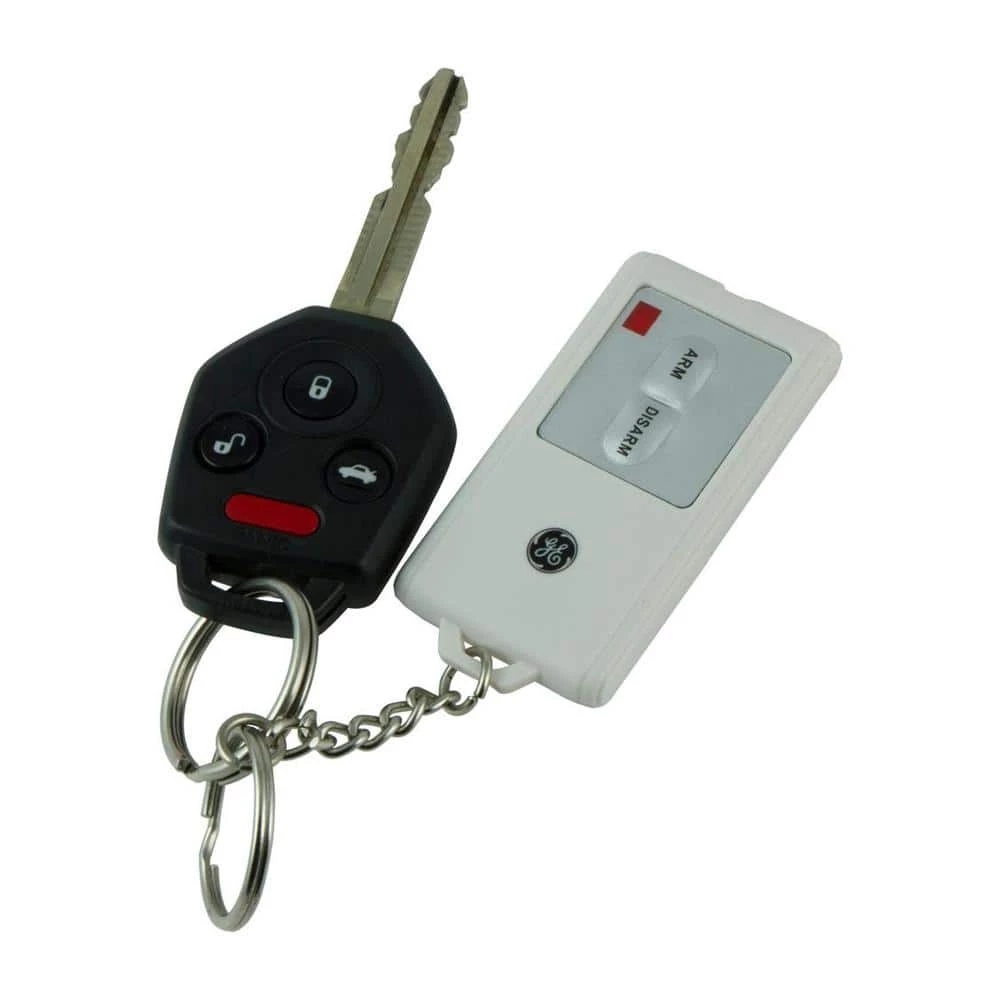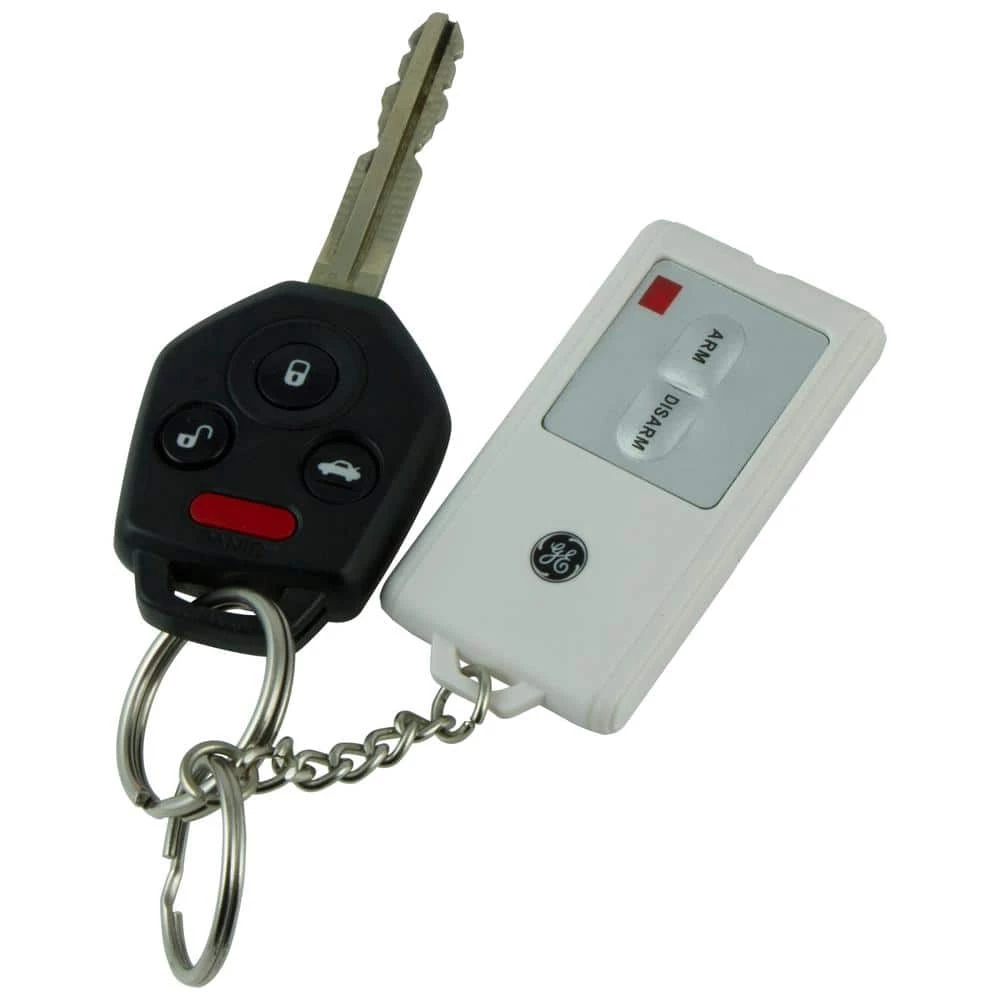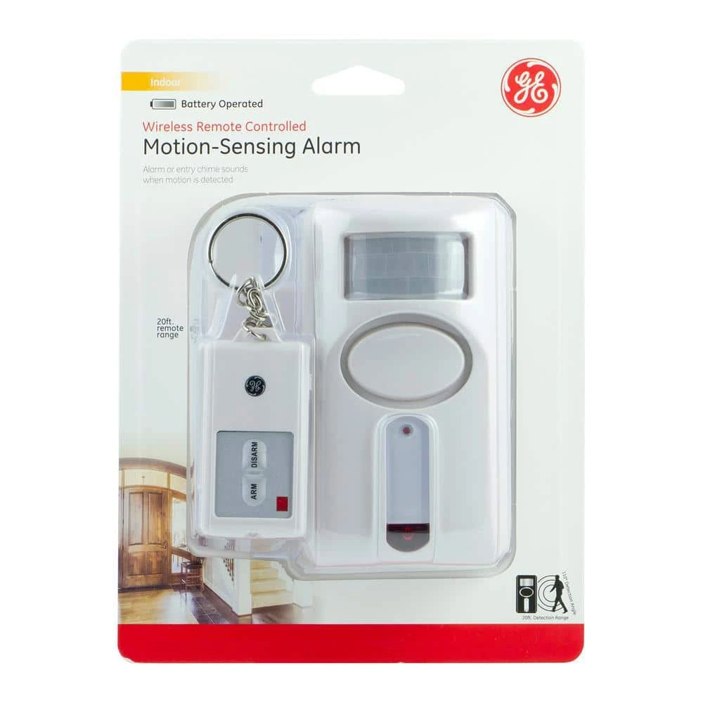 The GE Personal Security Motion-Sensing Alarm with Keychain Remote provides peace of mind by deterring would-be intruders within a 20 ft. range. This simple-to-use, cost-effective security solution helps protect you and your family against home invasions thanks to the 120dB alarm, loud enough to make a would-be intruder think twice about entering your home. The motion sensing alarm features an away mode which offers a 45-second exit delay and a 30-second entry. Use the remote to easily disarm the alarm before entering your home and to select alarm or chime mode. The unique security code between the remote and the alarm provides additional security and convenience – no need to remember another code. Additional remotes can be purchased. Quick and easy installation means your home will be secured in minutes. Ensure that your motion-sensing alarm is always ready with the low-battery indicator light. This alarm requires 1 CR2032 battery (included) and 3 AA batteries (not included). All installation instructions are included. This product is backed by a 90-day limited warranty.